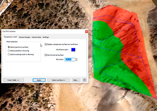 - Instantly get cut-fill volume calculations, comparing with another mesh inside a region defined by selecting points on the mesh or selecting an existing closed polyline in the drawing. You can preview the cut and fill areas with color and transparency and insert a summary cut-fill volume table in the drawing, along with the plan view image of the area analyzed.