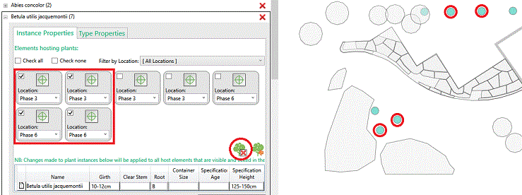 Plant Browser - manage planting model content via intelligent edit + substitution tools and Plant Browser - dedicated panel showing all planting model content in a structured list view and associated graphical plan view.
