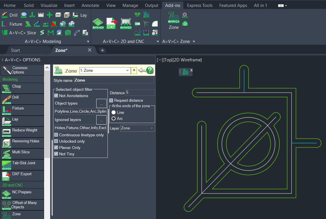 Another application of this program will be useful for CNC milling technologists. You will be able to construct a sampling contour along the trajectory of the circular cutter. For example, draw a polyline with a snake and call Zone with a distance of 5mm. You will receive a contour with a width equal to the size of a cutter with a diameter of 10 mm, repeating the shape of the original polyline with roundings at the ends. Now you can extrude this outline from the 3D solid.