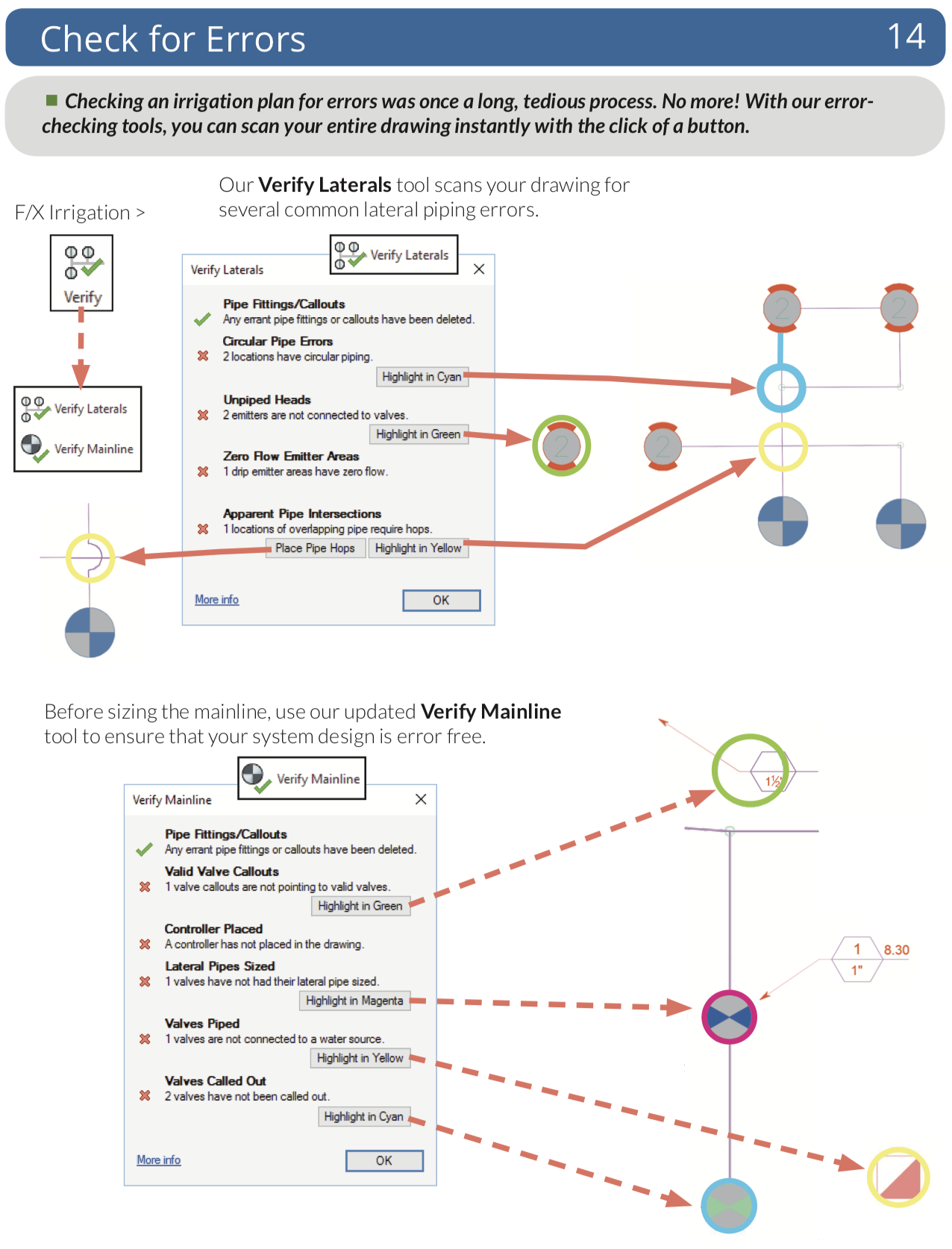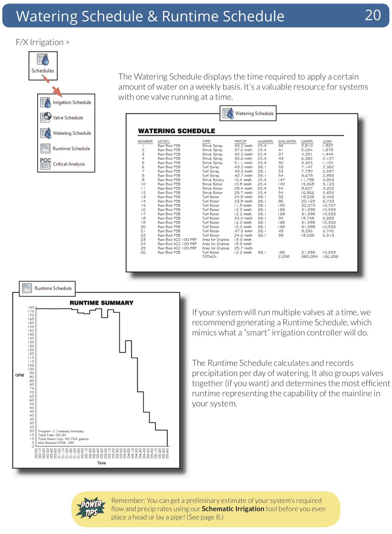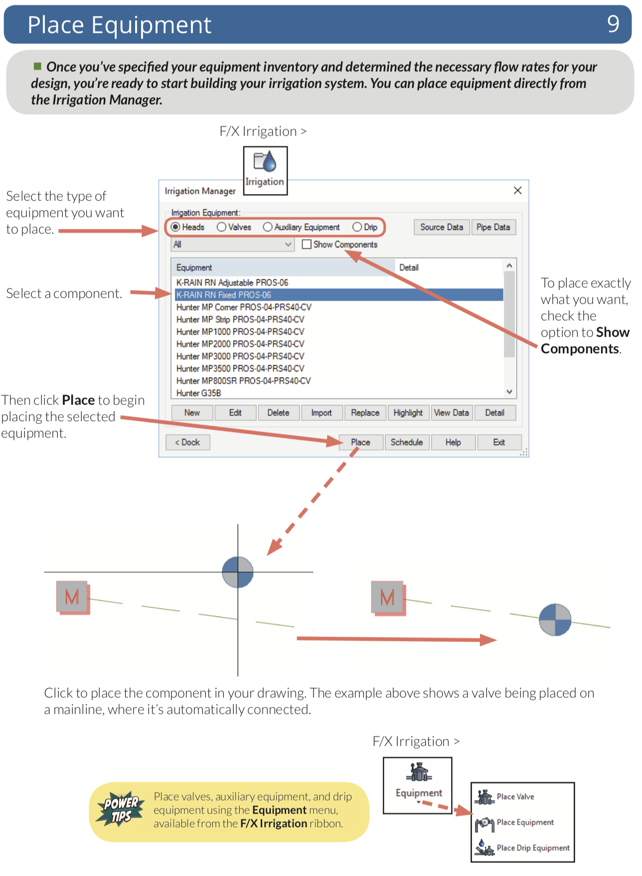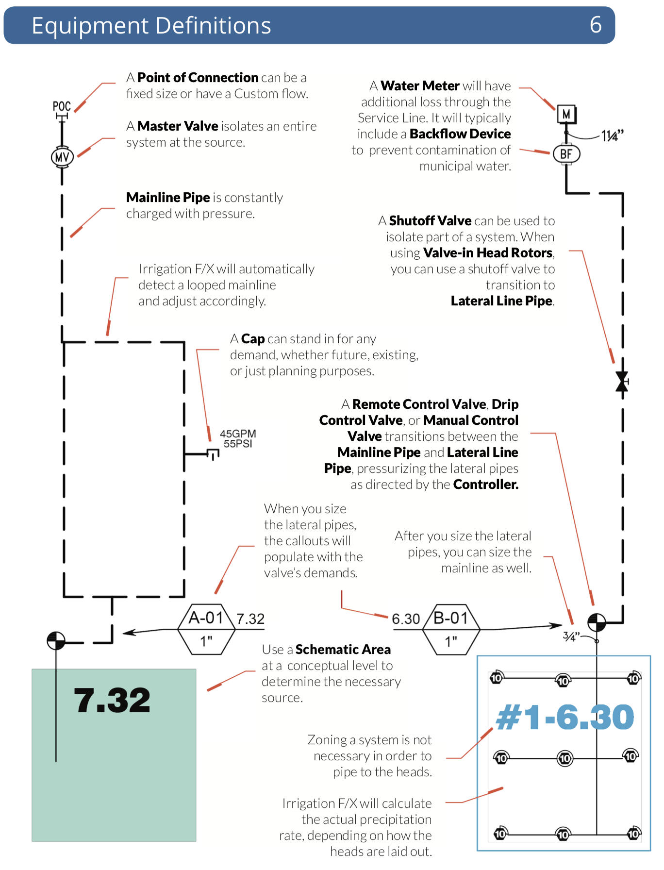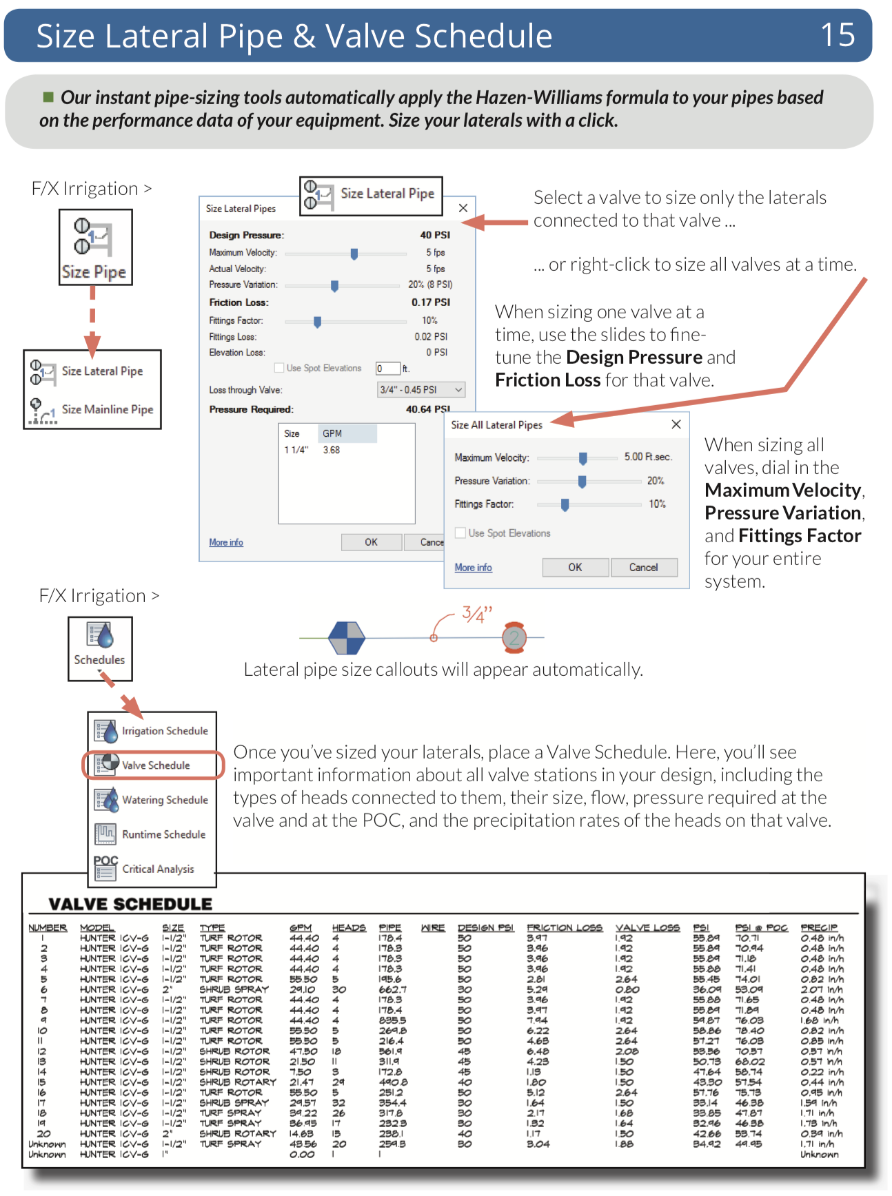 Place valves, heads, and other equipment throughout your design quickly, choosing from an immense symbol library, or simply use your own existing symbols. Draw and size pipe, calculate pressure and flow automatically, label pipes and valves, and place irrigation, watering, and runtime schedules – all with just a few clicks.