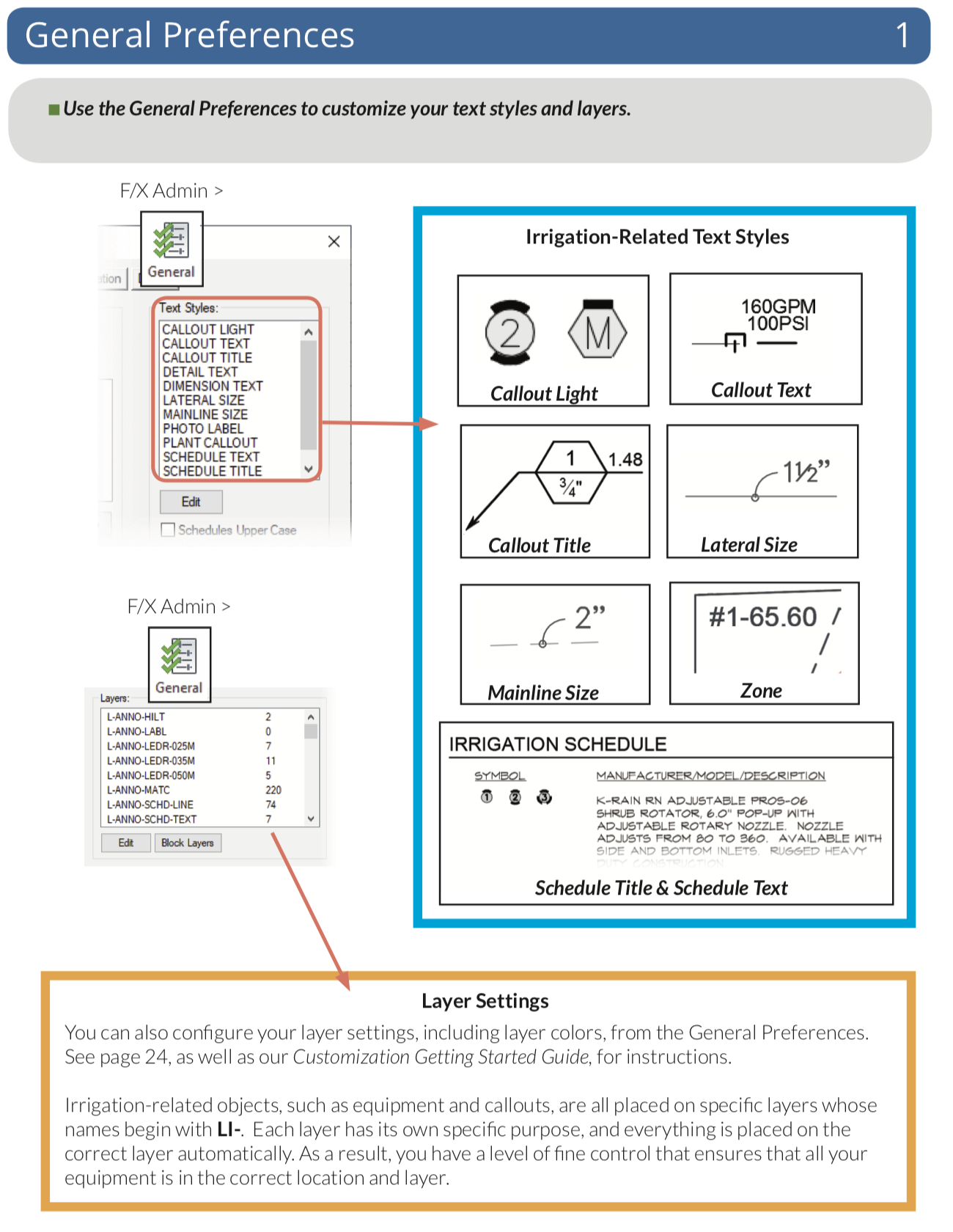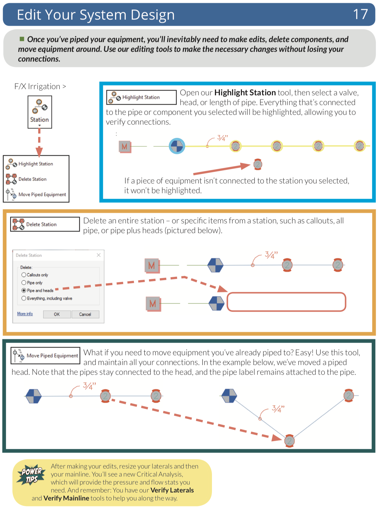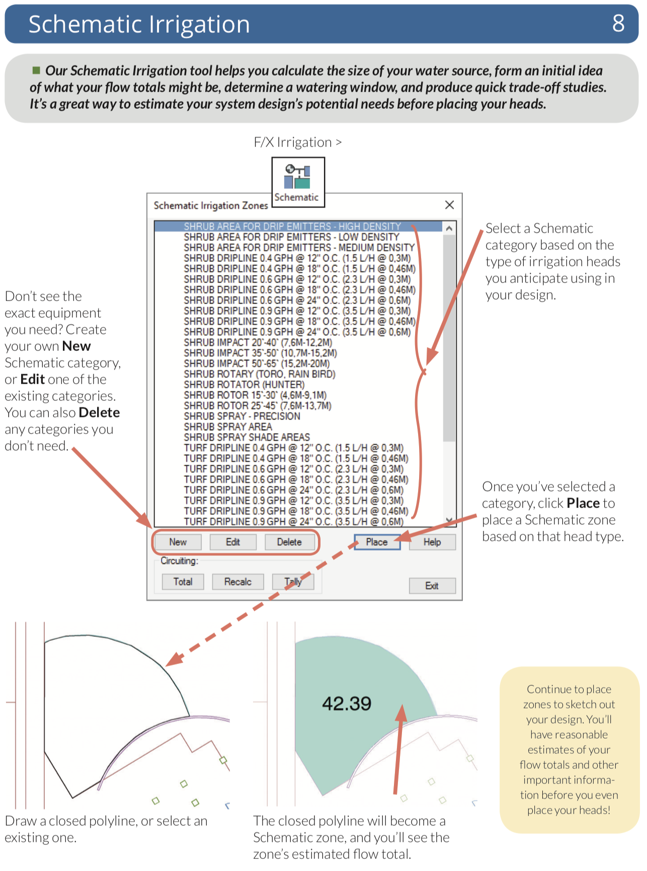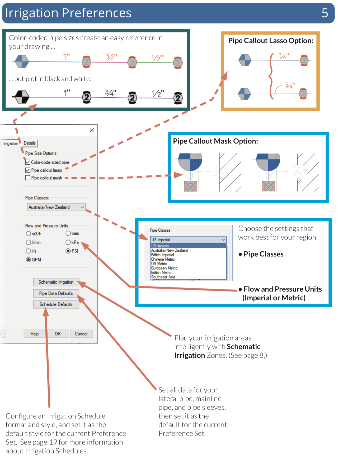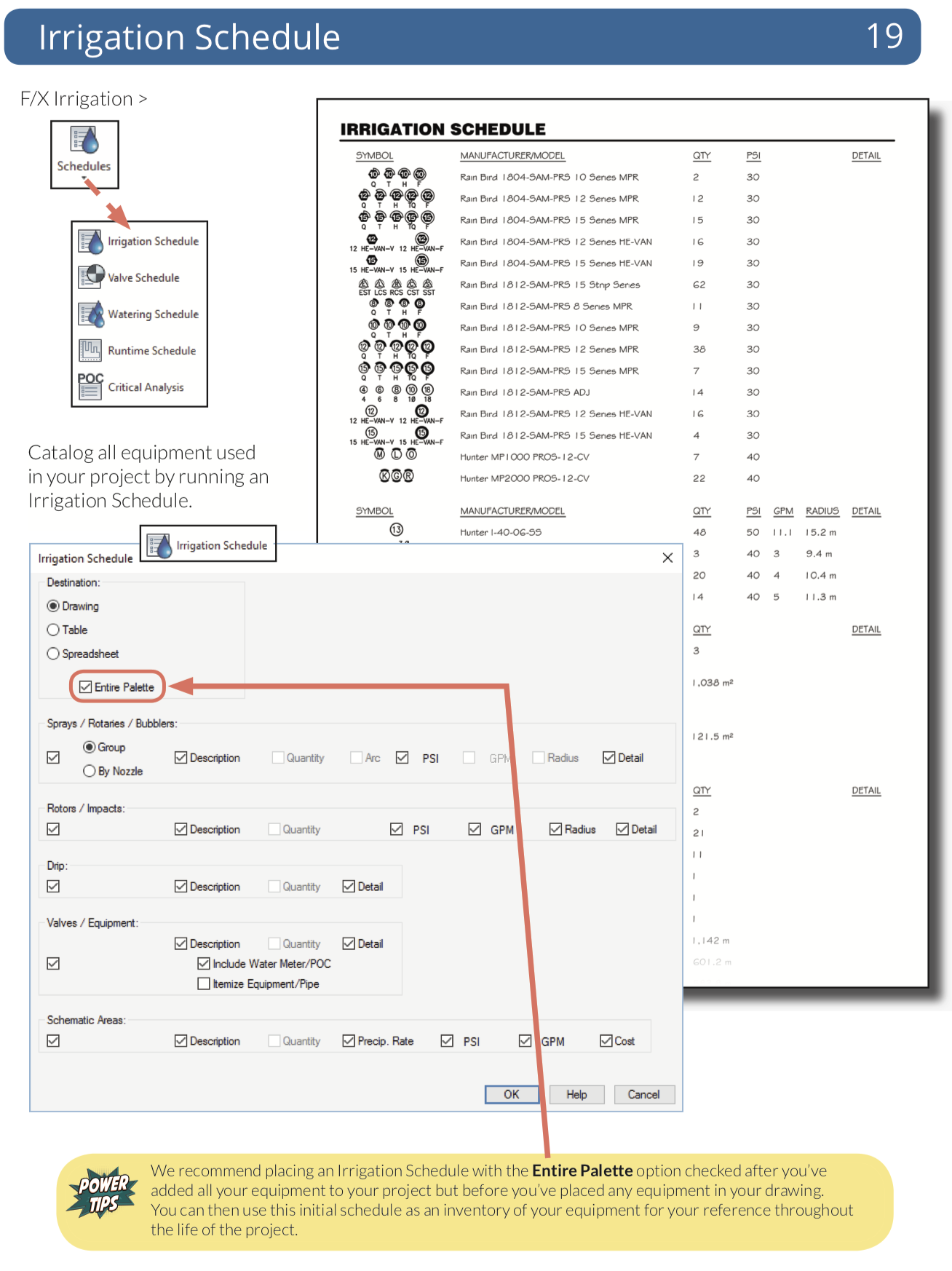 Place valves, heads, and other equipment throughout your design quickly, choosing from an immense symbol library, or simply use your own existing symbols. Draw and size pipe, calculate pressure and flow automatically, label pipes and valves, and place irrigation, watering, and runtime schedules – all with just a few clicks.