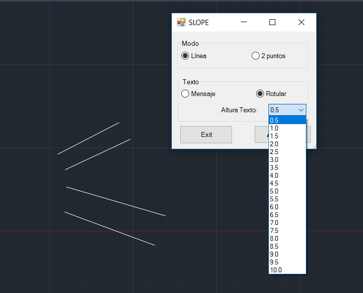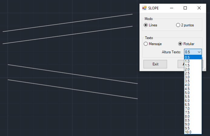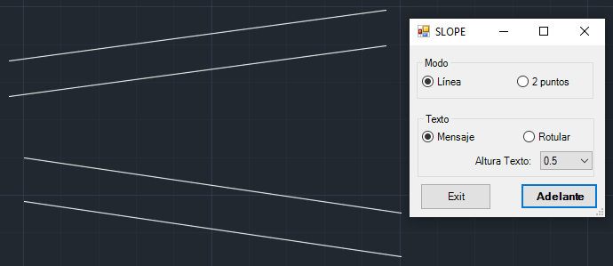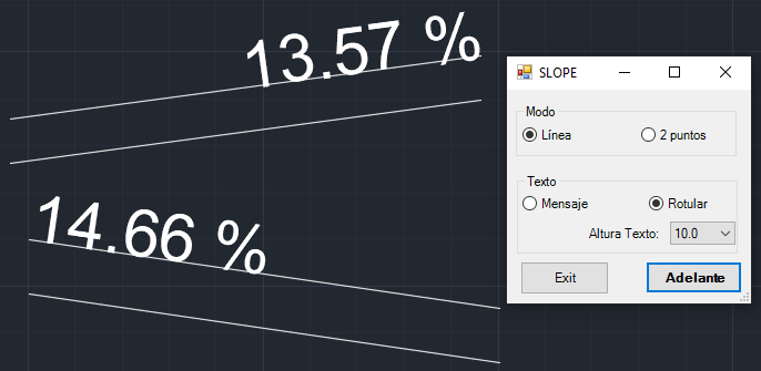 La aplicación calcula la pendiente de una línea o dos puntos, pudiendo escoge a su vez, entre que nos de la nformación de la pendiente mediante un cuadro de diálogo o que rotule el texto mediante la solicitud del punto de inserción del mismo y su altura, escogiendo de un desplegable la altura deseada.