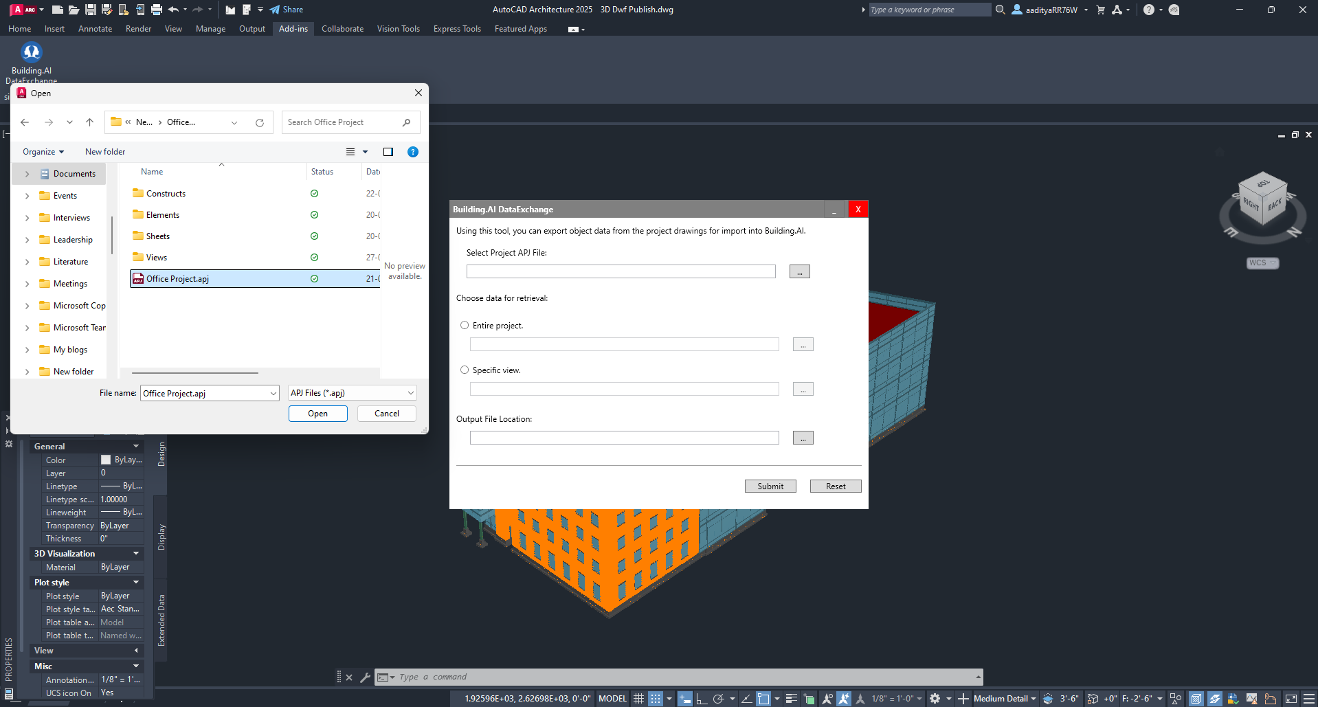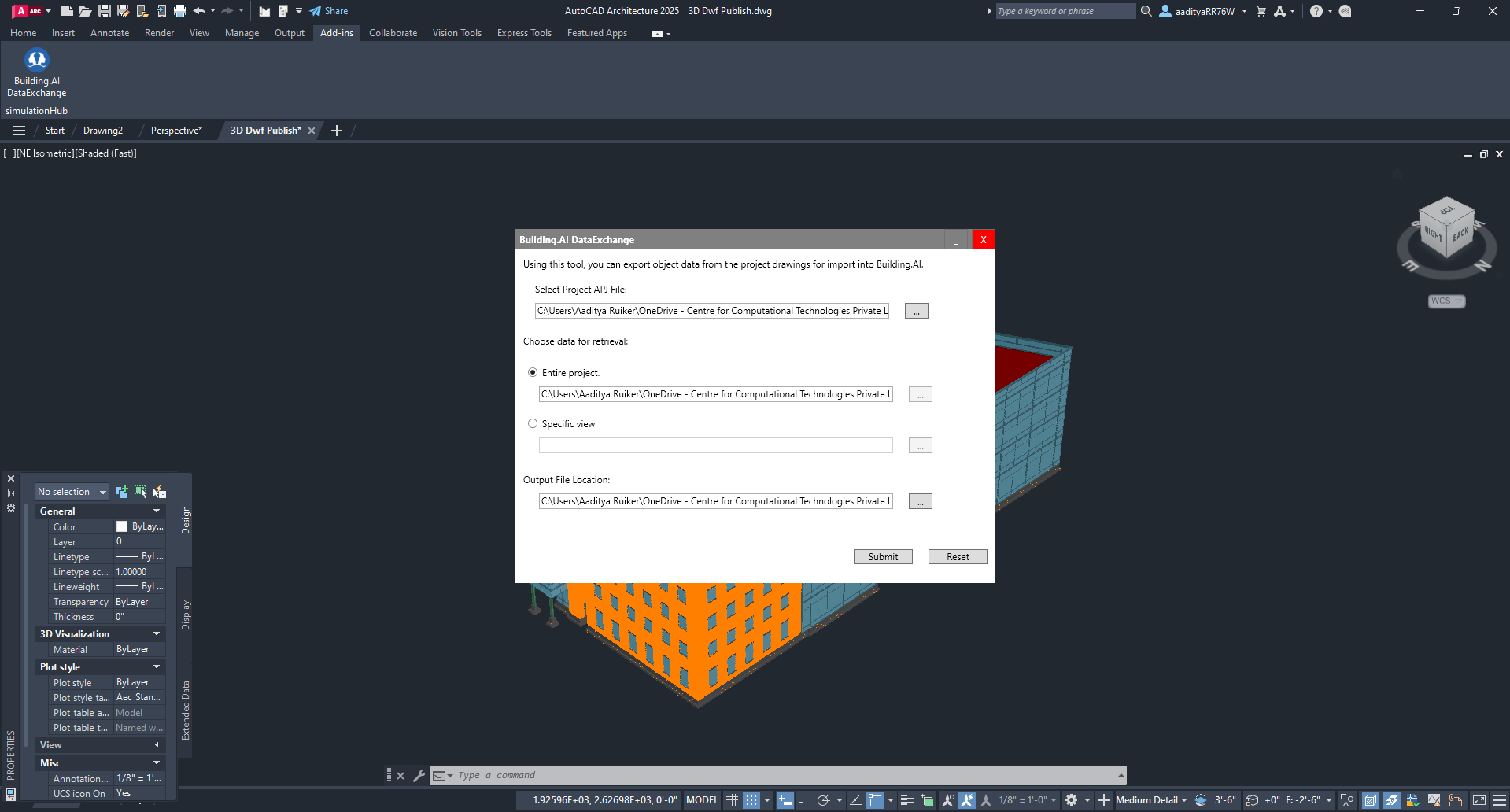The BuildingsAI DataExchange is designed to simplify the conversion of Autodesk® AutoCAD® Architecture designs into 3D Autodesk® Revit® models. This app extracts building data—including dimensions, meta-properties, and elements like walls, windows, doors, and floors—and exports it into JSON format, streamlining the transition to BIM workflows in the BuildingsAI platform.