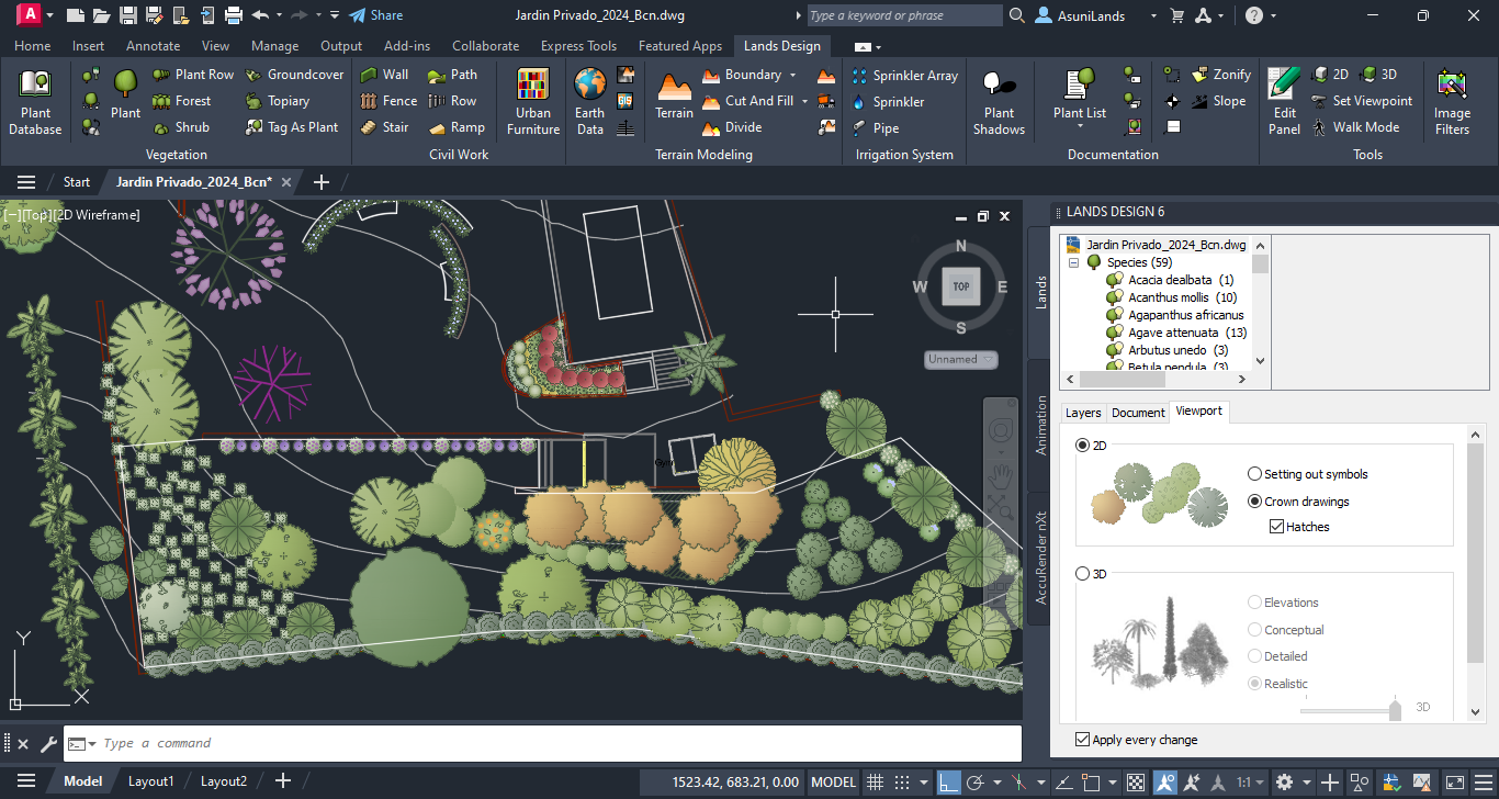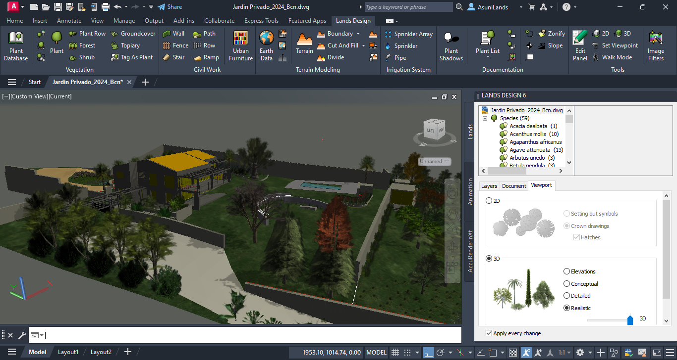 Lands Design is a professional BIM software for landscape design. It lets you develop 2D drawings and 3D technical models of the project while easily switching between 2D and 3D with just one click. By leveraging BIM technology, Lands Design automatically generates quantity takeoff lists of plants, Earthmoving operations, furniture, and other materials. It lets you collaborate easily with other architectural and civil engineering software programs supported by Autodesk® AutoCAD®.