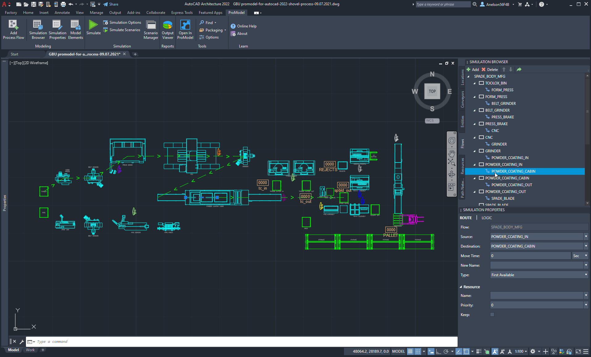 Create an AutoCAD layout using Factory Assets (or AutoCAD blocks) to represent the stations or operations required to make your product. Then build the process model using flows and other features from the ProModel Ribbon on the AutoCAD menu.