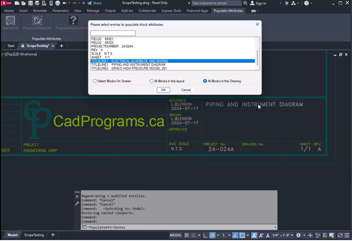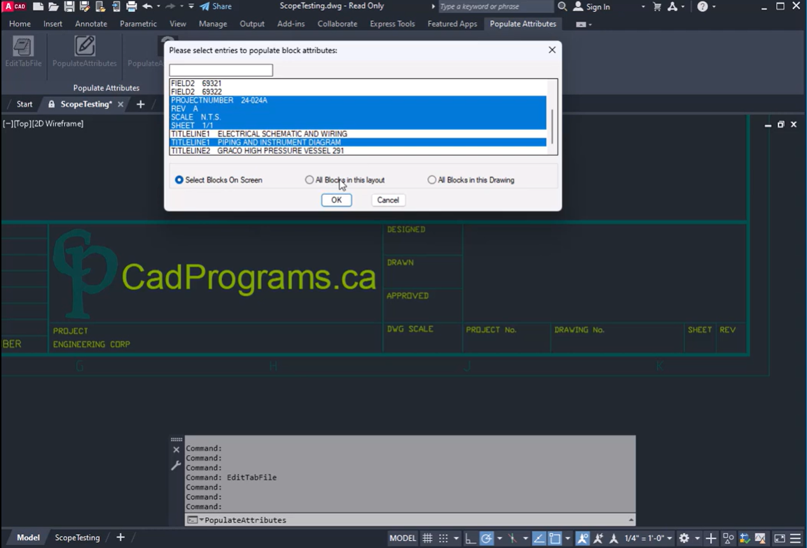 Select any number of entries in the dialog box, and then choose from the radio button whether you want to make an on-screen selection, process all blocks on the current layout, or all blocks in the entire drawing.
