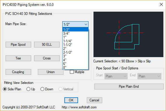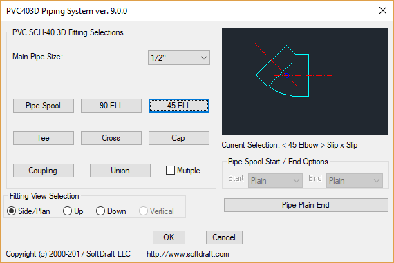 A dialog box interface provides an easy method for the selection of each fitting with different size selections and in one of three views, side, turned down or turned up. Place PVC pipe and fittings in a 3D model from within the WCS and without changing your UCS.