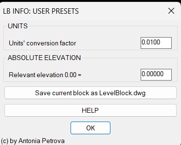 AutoLevelLabel allows one-click insertion of blocks, labeling the absolute and relative elevation of a point, and being automatically updated if moved. The first time you start an AutoLevelLabel command in a drawing, you're asked to place the 0.00 relative elevation and to specify the absolute elevation for it. A LevelBlock labeled 0.00=<your absolute elevation> is inserted. The following LevelBlocks you insert will automatically generate values for relative and absolute elevation. If you copy a LevelBlock, the values in the new instances of the block will be updated accordingly to their placement.