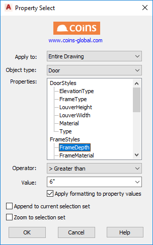 This utility is designed to search for and select objects based on their attached property data. This can be used, for example, to search for all doors with a particular fire rating, highlight them, and change their fire rating. The interface should be very familiar to users of the Autodesk® AutoCAD® Quick-Select routine.