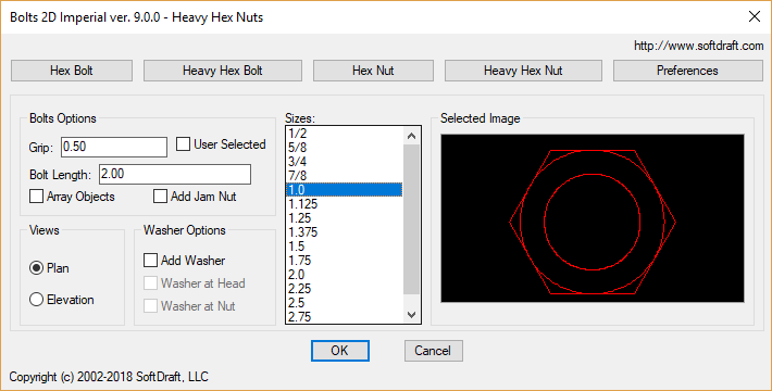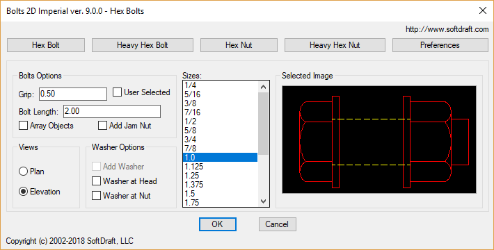 Bolts2D parametrically creates Imperial Bolts/Nuts/Washers in Plan or Elevation views for easy placement in steel details. Dimensional data for the bolts are stored in external ASCII data files which you may add additional dimensional information on bolts or nuts that are unique to your specific application. Default sizes are included in imperial and metric dimensional data files.