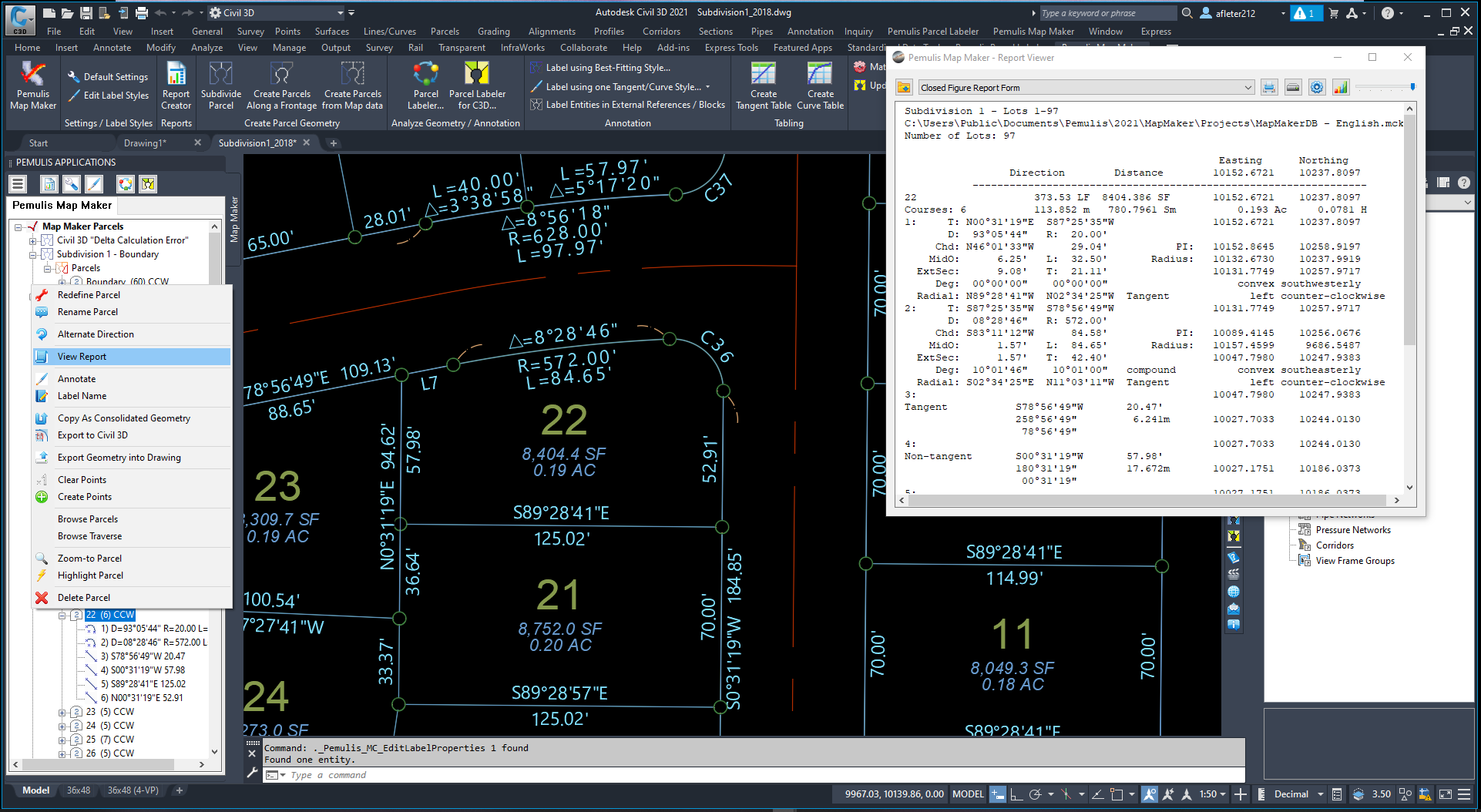 Find and fix geometry errors. For example, Pemulis Map Maker identifies where the sum of partial lengths doesn't add up to the overall length, or identify possible errors in the display of delta values in Civil 3D.