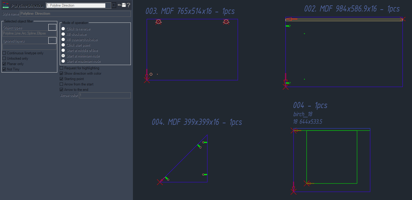 To prepare contours for milling or laser cutting on a CNC, it is important to set the correct direction of the cutting lines and the correct clockwise or counterclockwise bypass of closed contours. In addition, it is important at what point of the contour the cut will begin, the entry point of the cutter. To solve these problems, you need to clearly see where the starting point of the polylines is and in which direction they are directed. However, standard Autodesk® AutoCAD® tools do not allow you to see either the starting points or the direction. Only the property panel helps a little in this, but you need to deal with each polyline separately, which is very time-consuming.