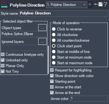 The Polyline Direction (PLineDir) program will help you in working with contours for CNC and for any other tasks where the direction and starting point of any curves are important. The program colors the curves and places conditional icons so that you can clearly see the direction and starting point. All these changes to the drawing are temporary, the colors of the curves will return to the original ones at the end of the command.