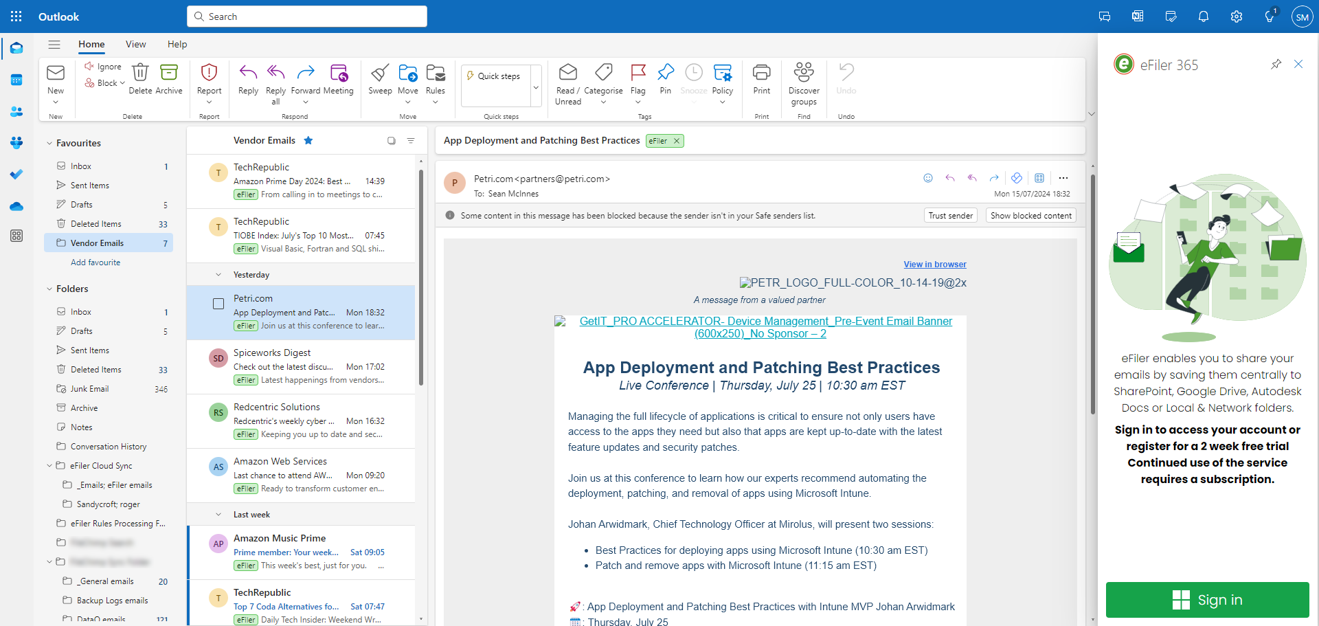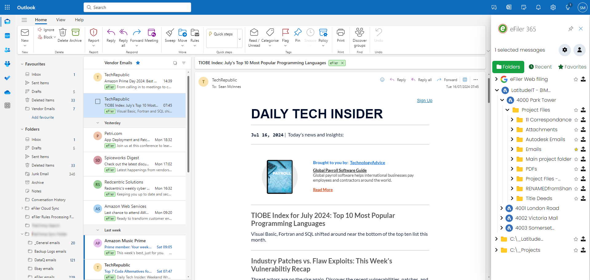 eFiler365 is a web application designed specifically for New Outlook. eFiler365 works across all devices including Outlook web access, the New Outlook desktop & iOS and Android mobile clients and Outlook classic itself. This version of eFiler complements eFiler+ which is only available for Classic Outlook. With eFiler365 there is no client-side installation. Emails are processed centrally, and all configuration is web-based.