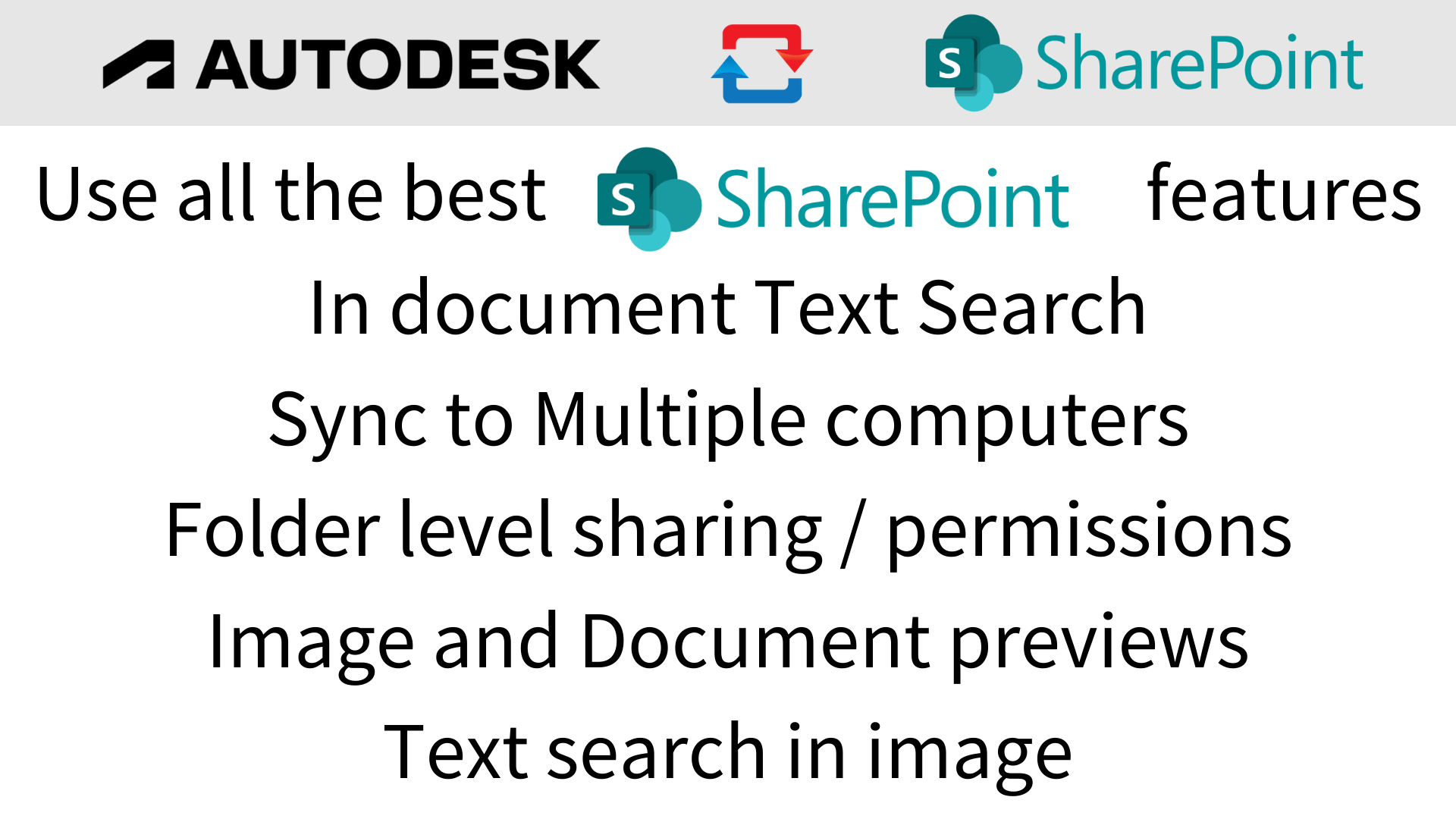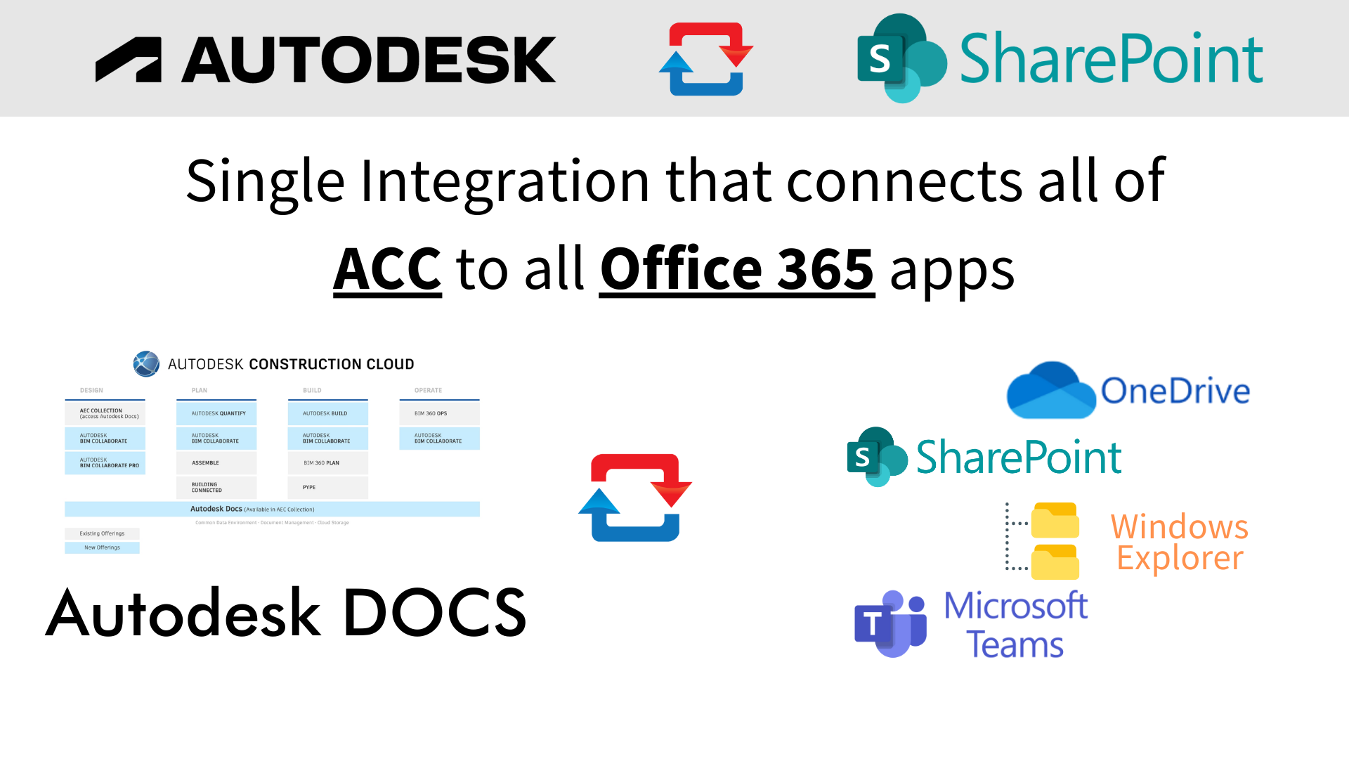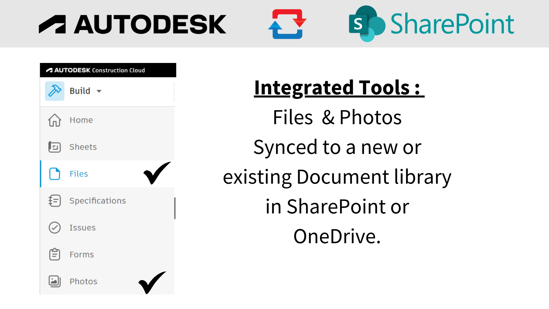 The integration between Autodesk Build® and Sharepoint allows Autodesk® customers to sync your Autodesk Build Documents and Photos in a full two-way sync between Autodesk Documents / Files and Office 365 / Sharepoint / Teams / OneDrive.