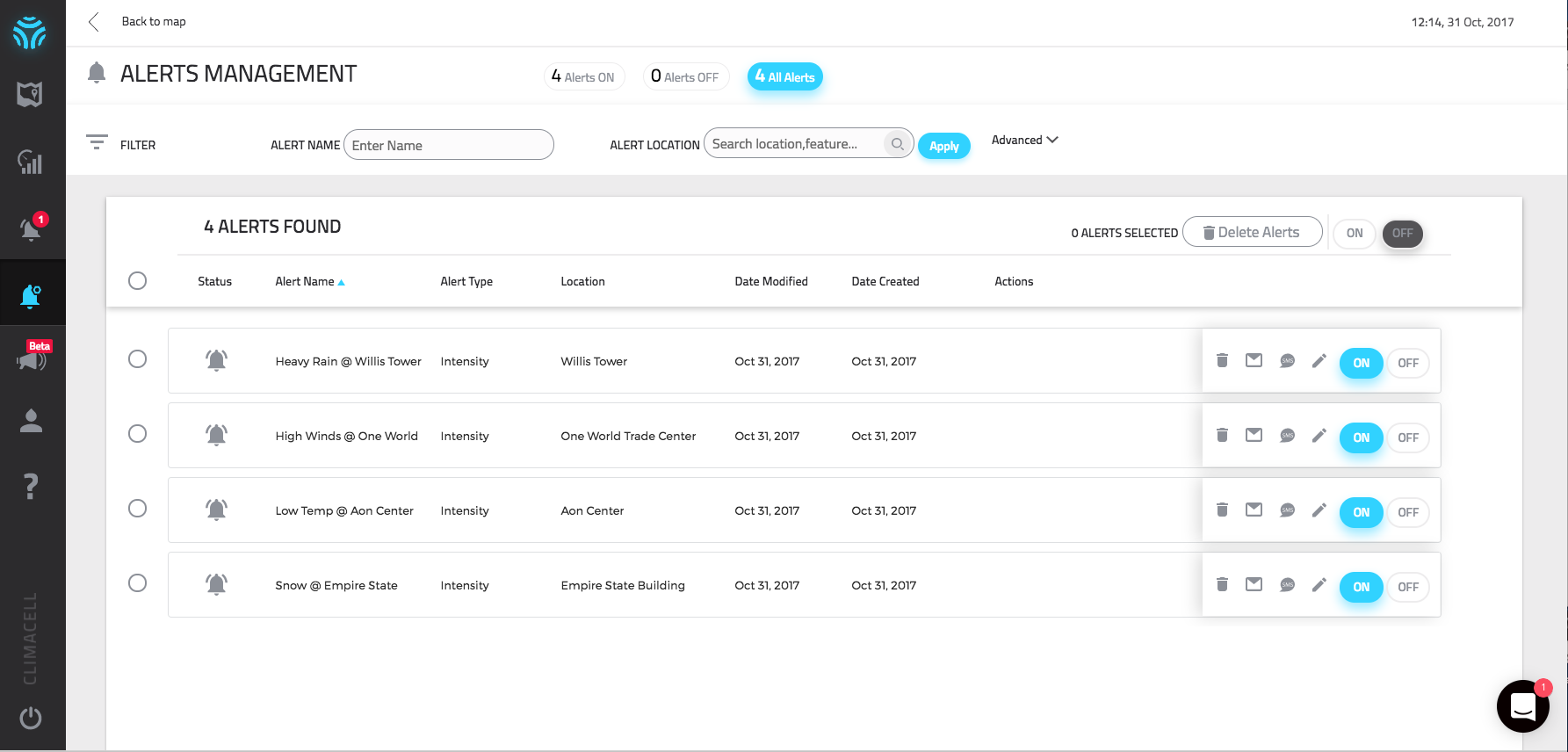 In addition, HyperCast features a new alerts tool (Weather Observer™). The alert system is designed to help you stay aware of the real-time and forecast weather events which affect you the most. The user can set thresholds for specific weather phenomena (i.e., rain intensity, or snow accumulation), and notify your team member via SMS or email hours before the event will take place. You can set the alerts, for specific pin locations, or for polygons.