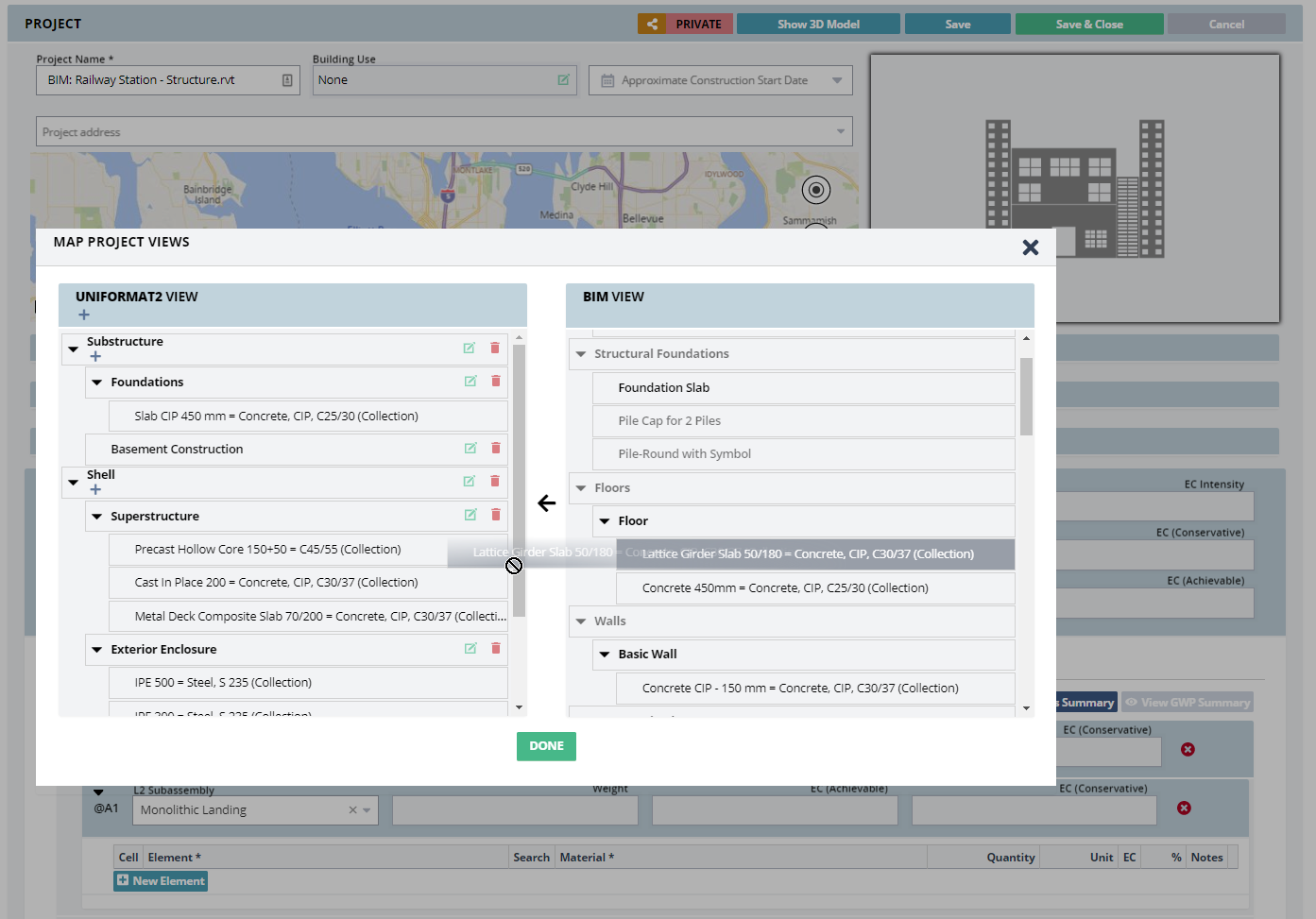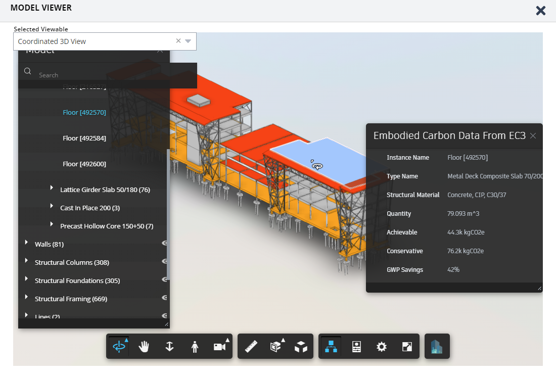 Autodesk® Revit® files on Autodesk Docs are brought into EC3 via the Forge interface, which enables displaying the results using the Large Model Viewer. Revit users whose family types include multiple layers of materials may prefer to use the Revit plugin 'tallyCAT' (https://www.buildingtransparency.org/tally/tallycat/) which is able to import multiple layers.