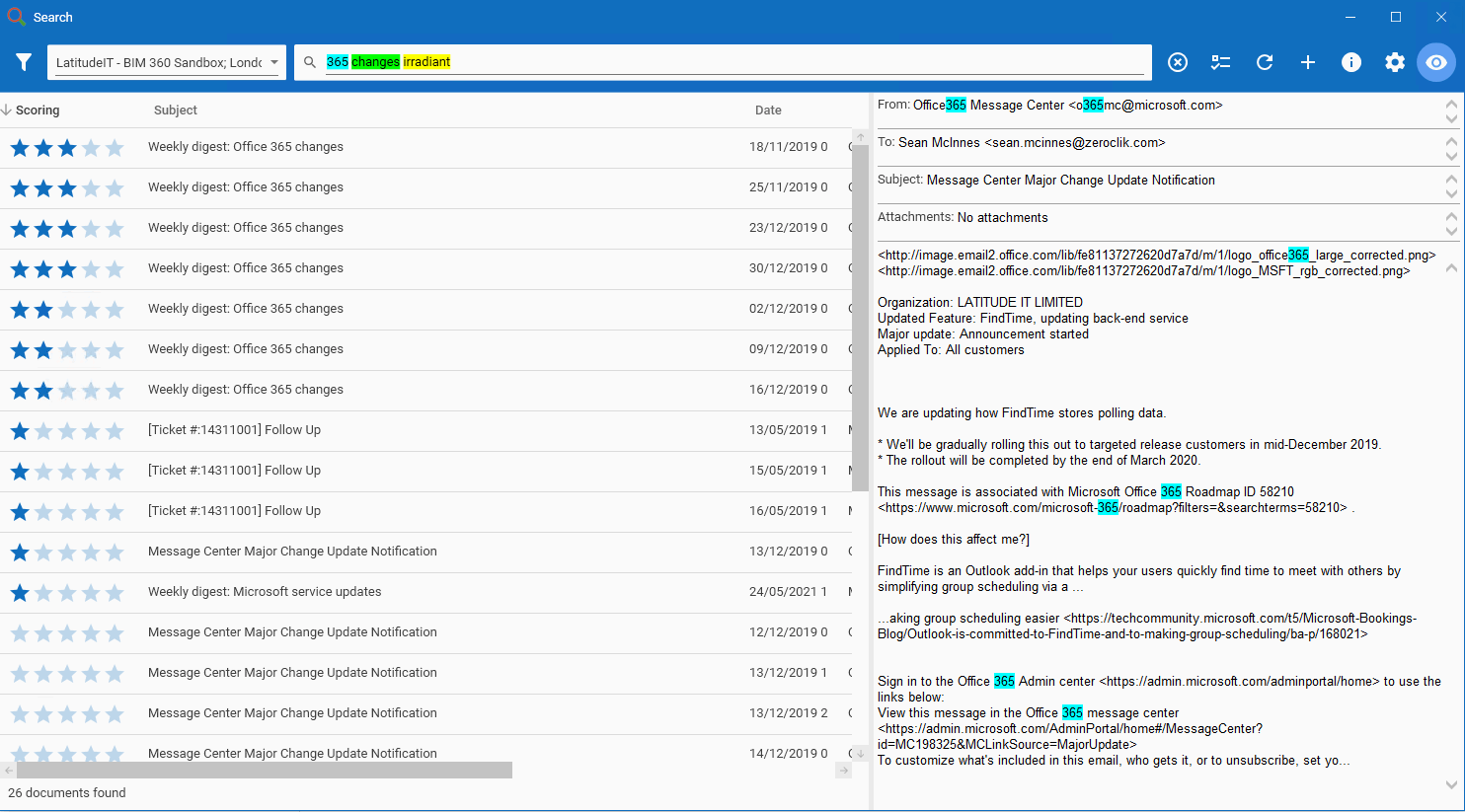 Select eSearch from the Outlook ribbon menu to search filed emails. Select the location to search and enter keywords in the Omnibox. Add filters as appropriate. Double click to open any filed email.