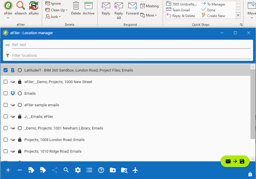 With an email selected, open Location Manager (click the eFiler 'e' icon' on the ribbon menu and select location manager) and click the + icon to add a new location.