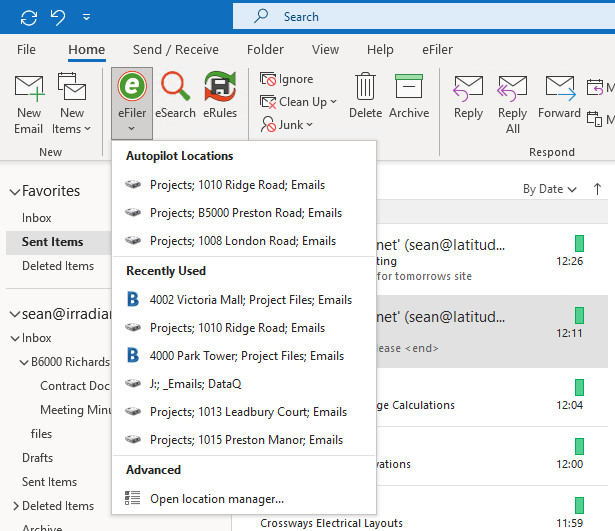 When you have returned to the Location browser expand the folders to select your first filing location. If required you can create a folder for Emails within your Project Files.