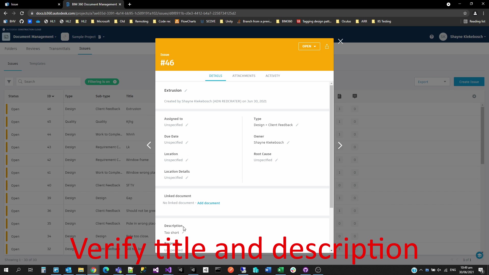 If you see an issue with either the model or actual build press the Add Issue Button, select the Type and enter a name and a description of the issue. If required you can take a picture of the issue and then click Submit.