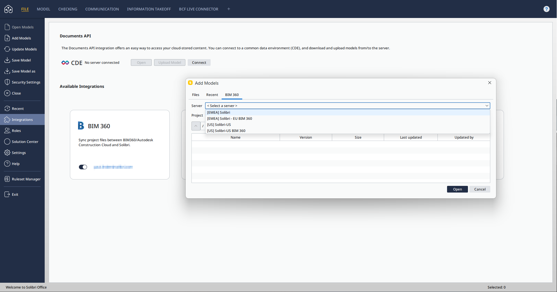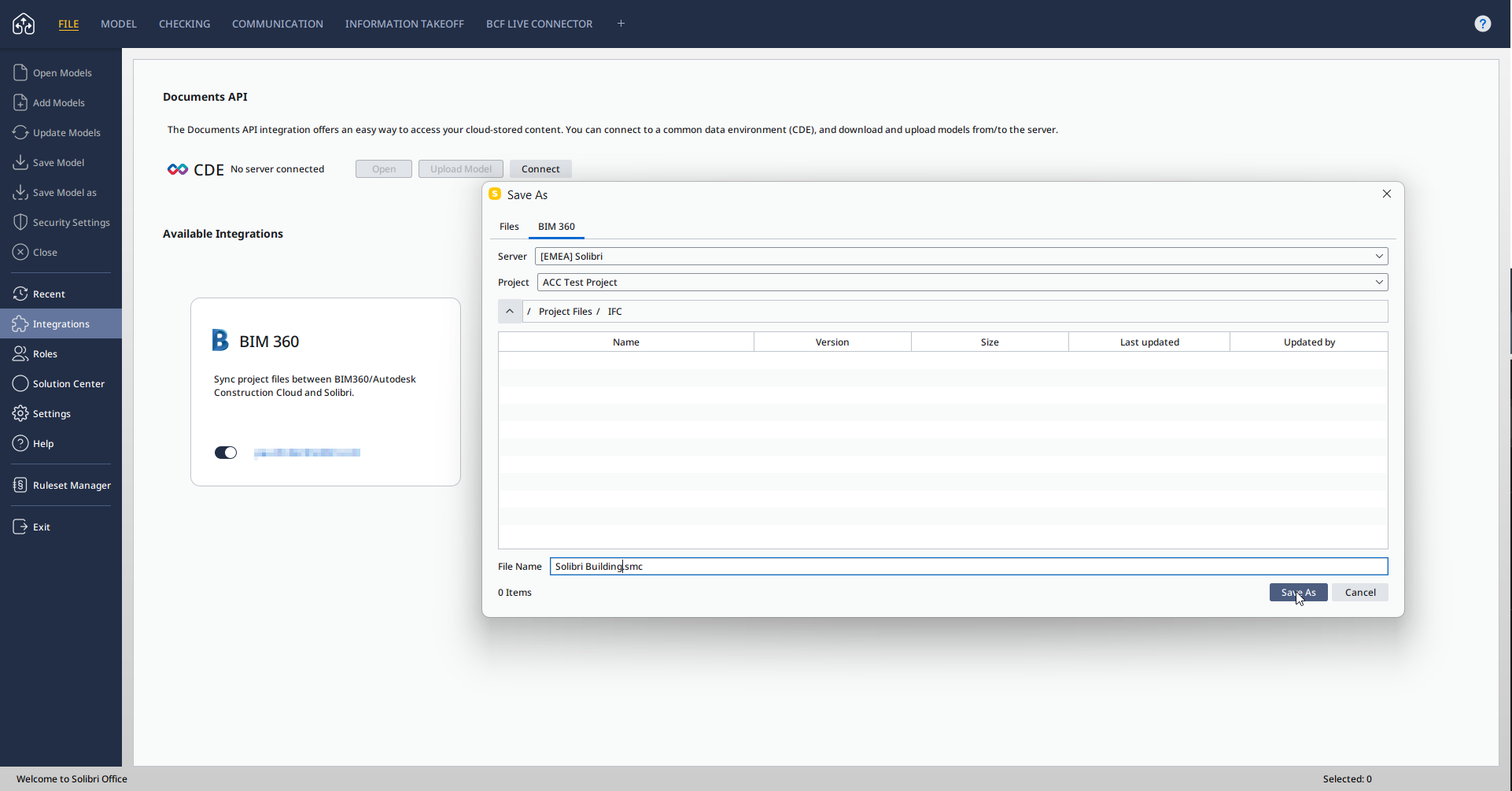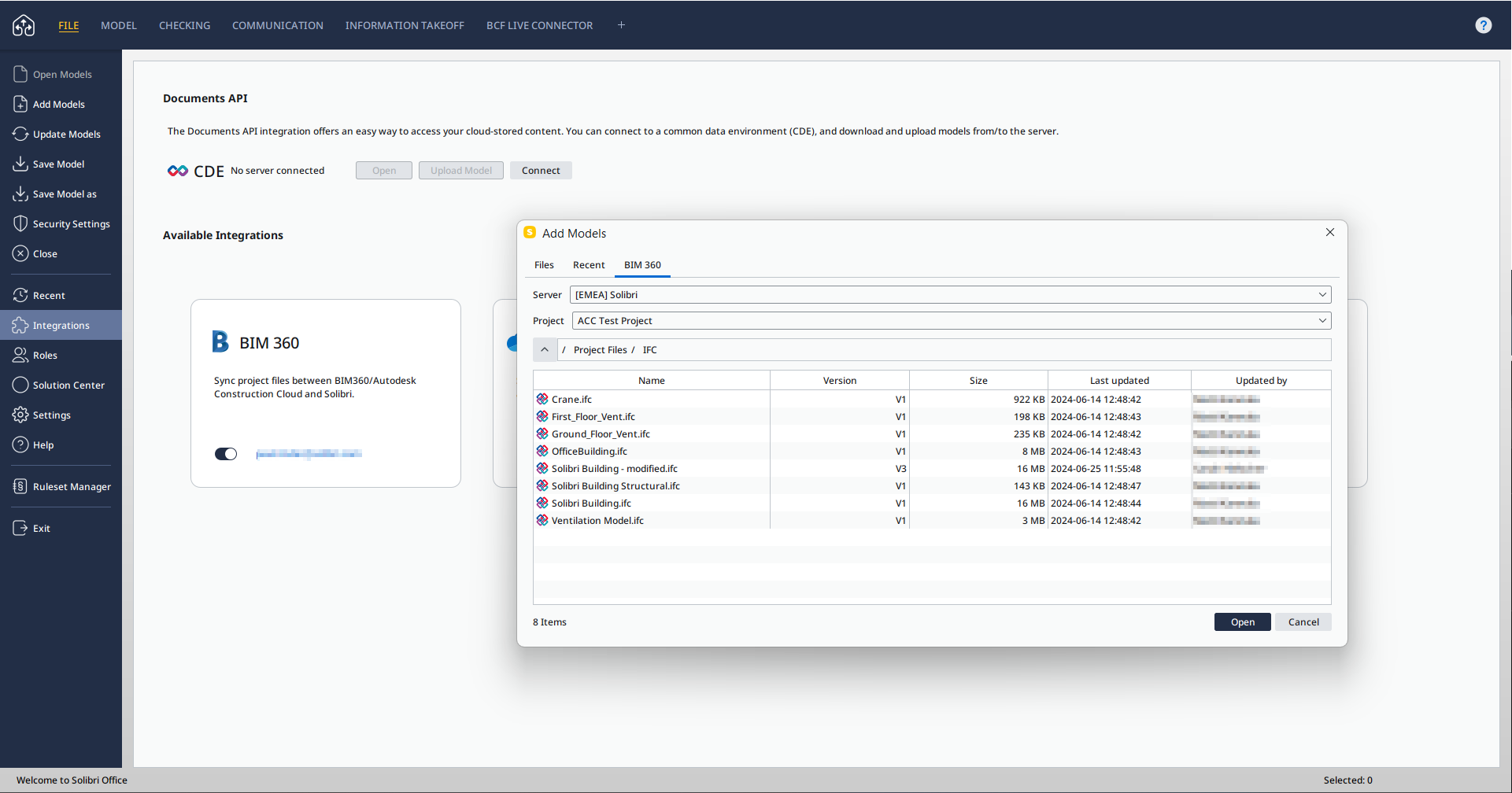In this version, users can open SMC, IFC, PDF files and other Solibri resources directly from BIM 360/ACC within Solibri. Users can also save SMC files and other Solibri resources back to the BIM 360/ACC server. Additionally, the "Update models" functionality can be used in Solibri with files that are located on the BIM 360/ACC servers.