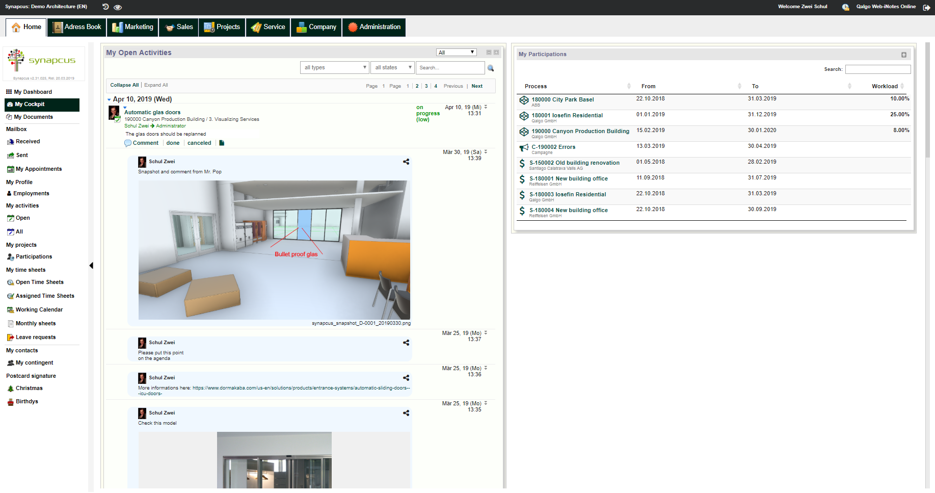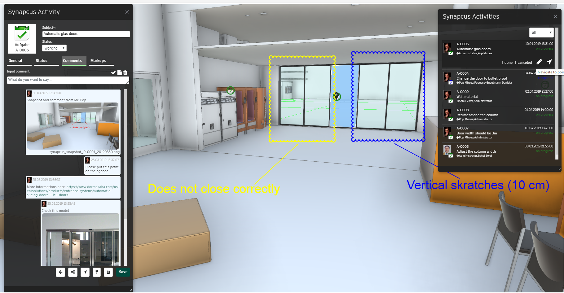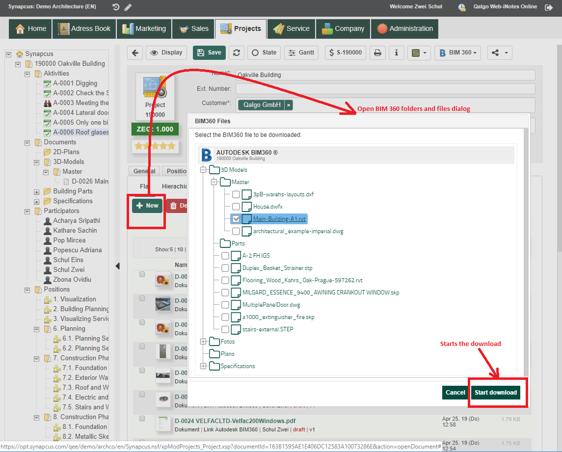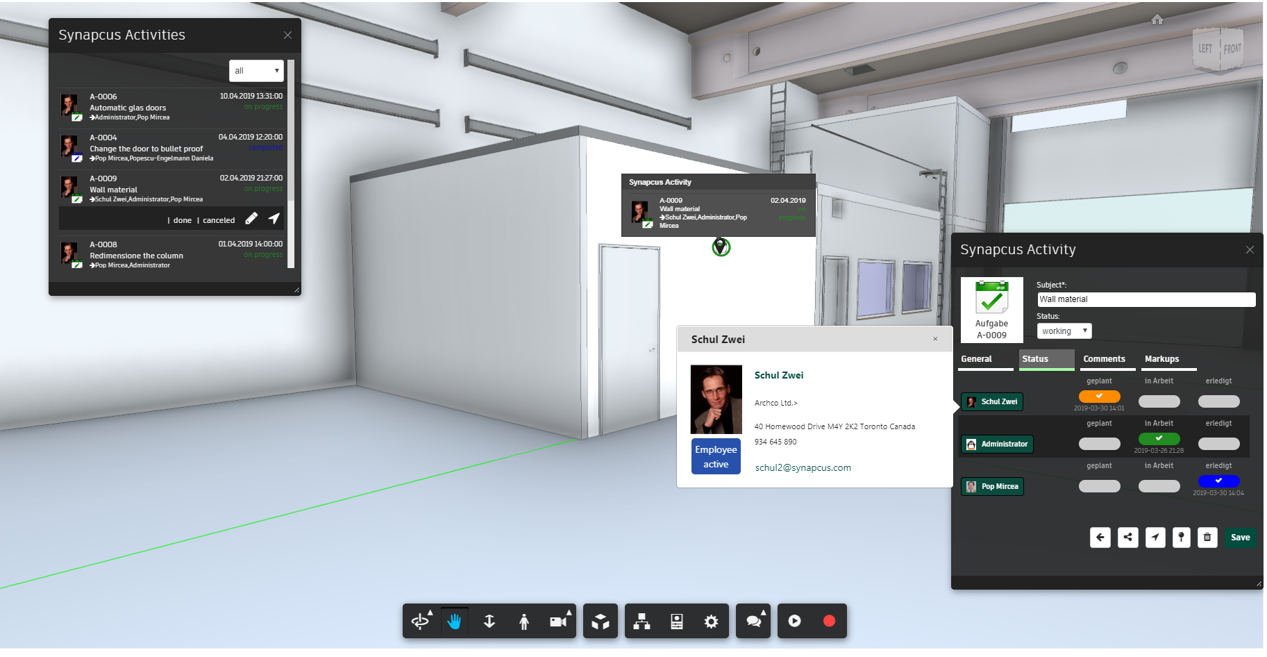 The tight integration between all its modules (Project, Sales, Documents, Human Resources, Finance) is accomplished mainly through the Synapcus activity driven architecture. Some of these activities (to dos, tickets) can also be created and managed directly in the 3D Forge-Viewer using Autodesk® BIM 360® data. All the alerts and notifications will be signalized in the users cockpit and in its home area as well as through HTML system emails.