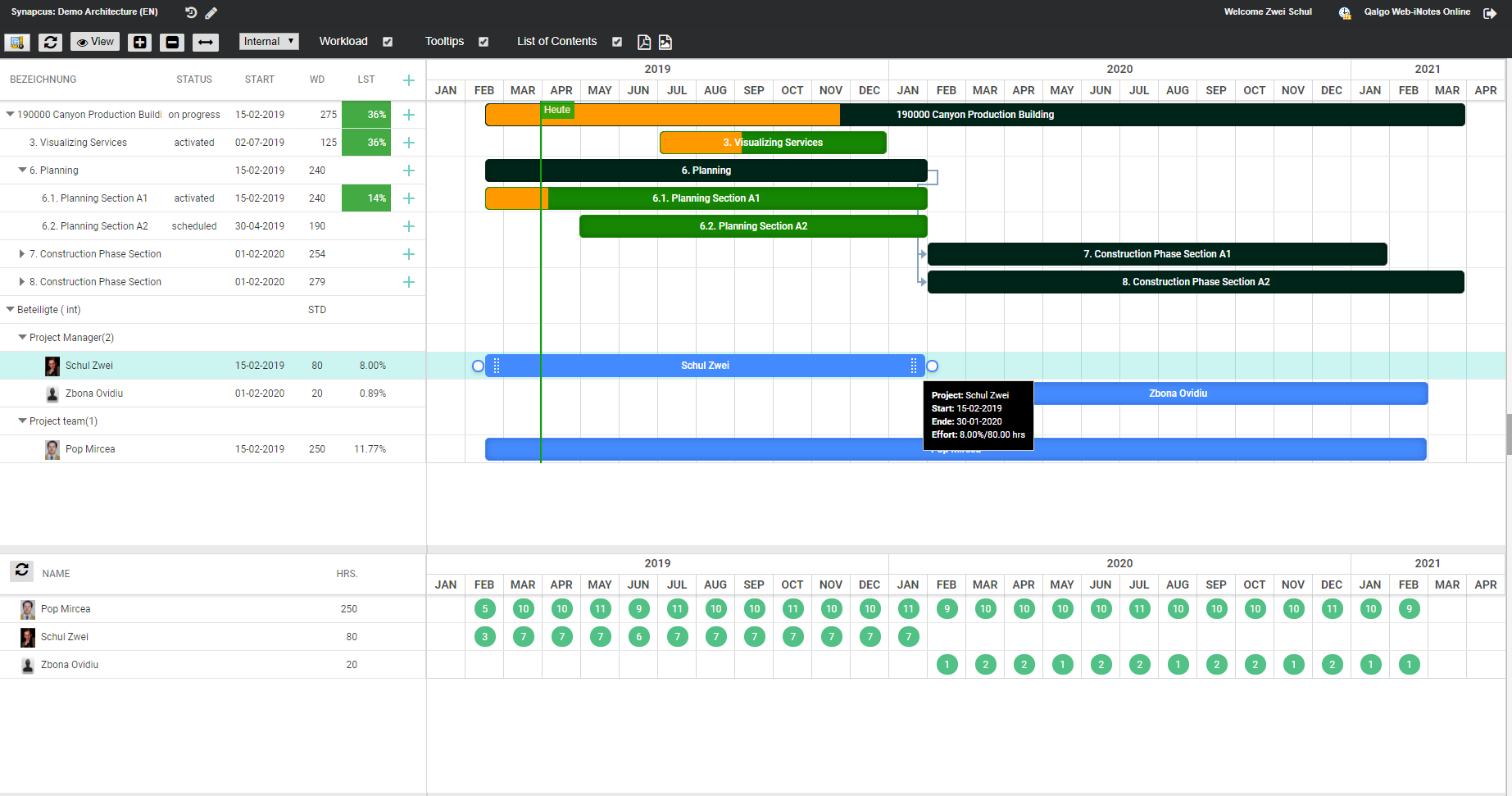 With Synapcus:360 general planning companies, architects and engineers can digitalize and easily manage all their organization's internal and external processes (projects, opportunities, campaigns, change requests) and workflows - including the communication with the customers, subcontractors and other stack holders. Various graphical tools (like a detailed interactive Gantt, load-matrix, histogram, Forge-Viewer, drag&drop calendar) allow the users a highly intuitive data experience.