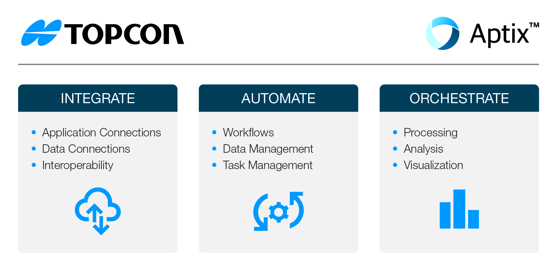 As part of the Topcon family of products, Aptix™ integrates both software applications and sensor applications to provide summary reports on materials, people, and equipment. Aptix™ delivers a multiplier effect benefit by integrating several typically disparate project data sources into one automated workflow and reporting process. Aptix™ integrates third-party applications from scheduling to reporting to telematics and machine control systems. With the Aptix™ platform, you can integrate third-party AEC software, including scheduling and other field operations tooling to build a Digital Twin of your jobsite.