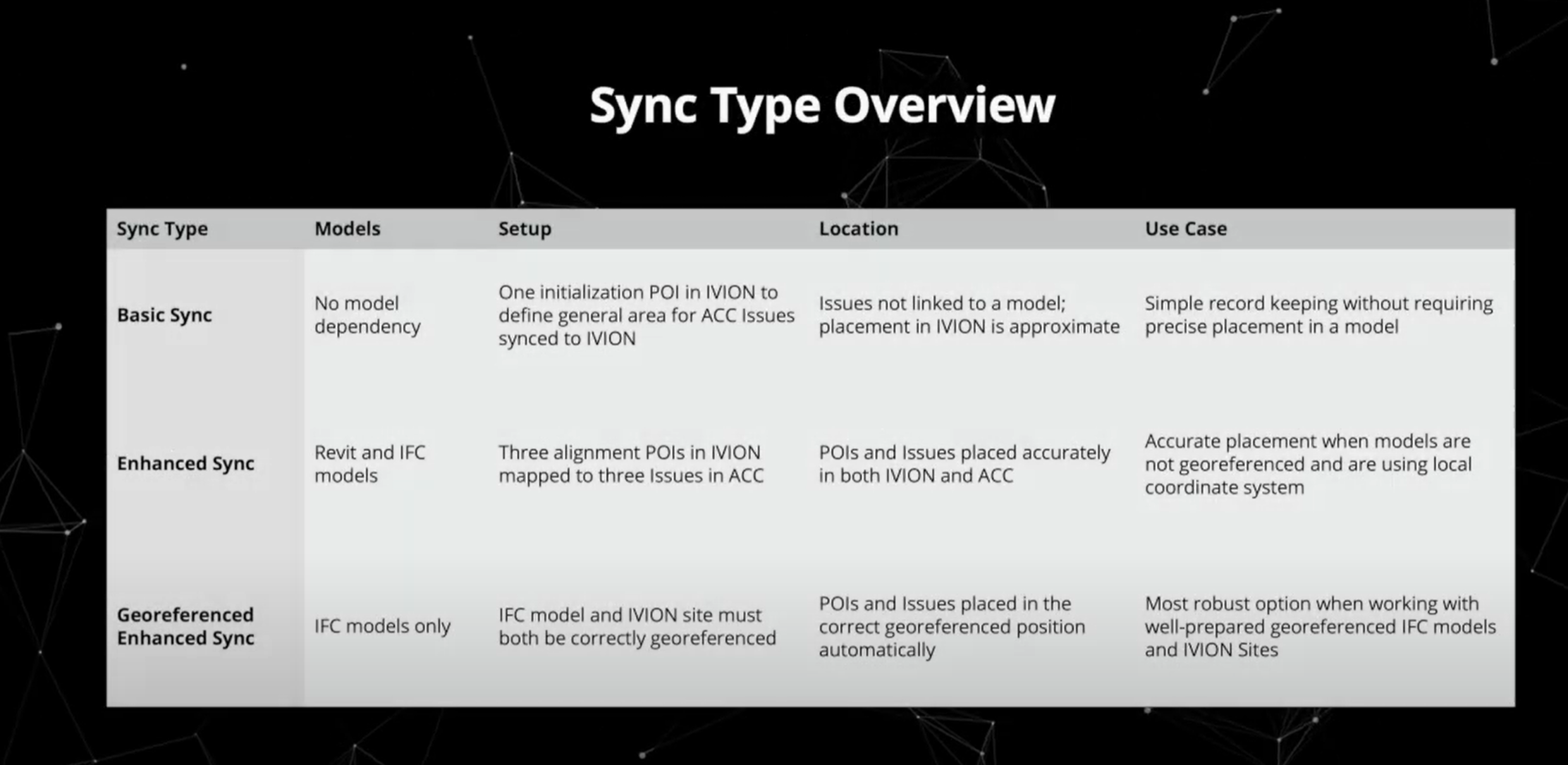 The NavVis IVION Connector for Autodesk Construction Cloud offers three types of sync: