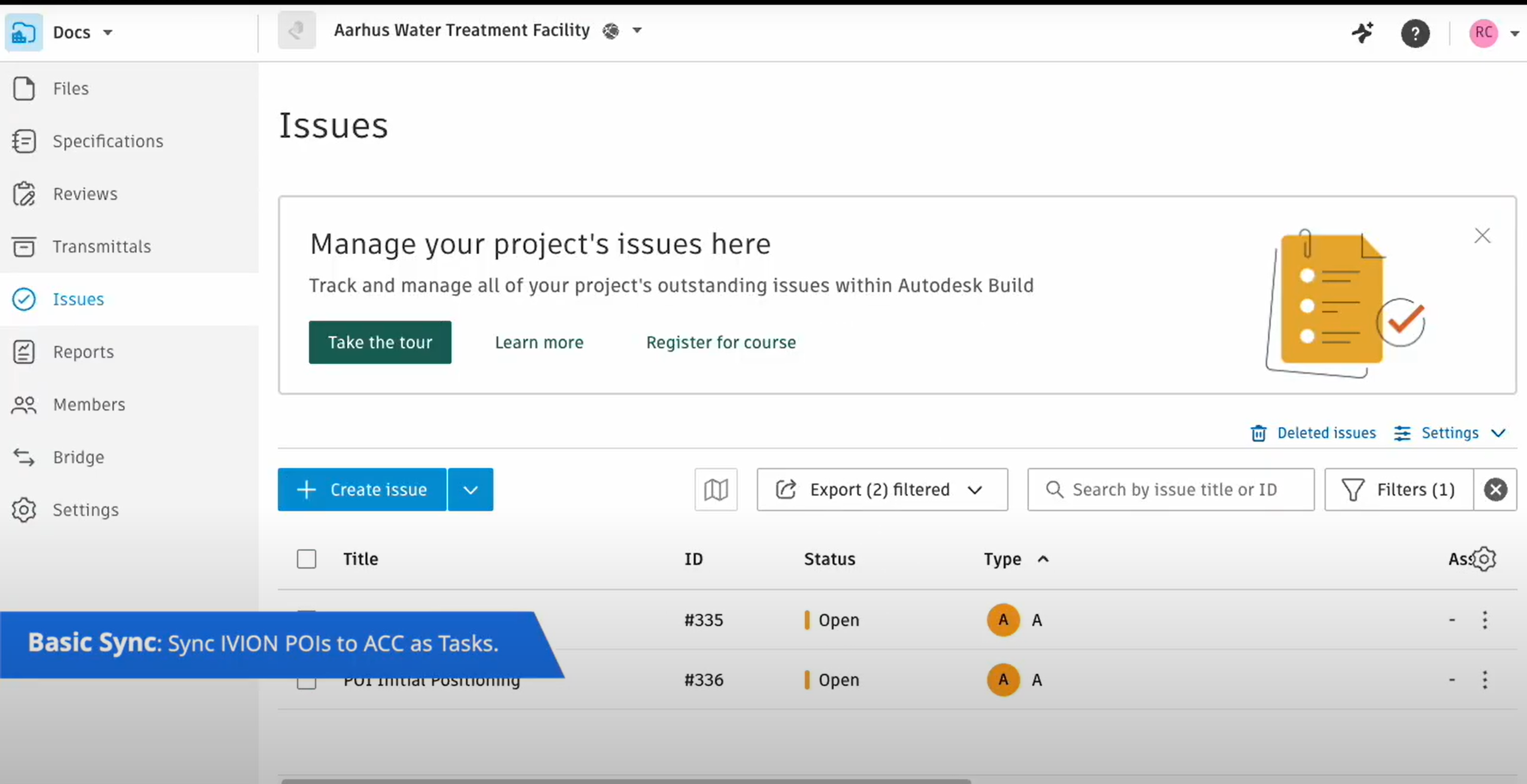 The NavVis IVION Connector for Autodesk Construction Cloud® connects points of interest (POIs) in NavVis IVION with Issues in Autodesk Construction Cloud (ACC) and keeps them synced. This allows users in AEC and other industries to improve issue detection, tracking and resolution by combining large-scale, high-accuracy NavVis as-is data from construction sites and buildings in NavVis IVION with ACC’s industry-leading issue and document management.
