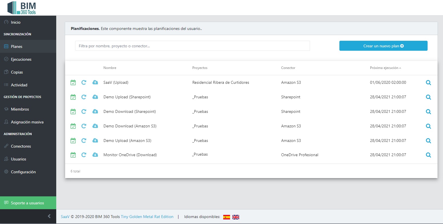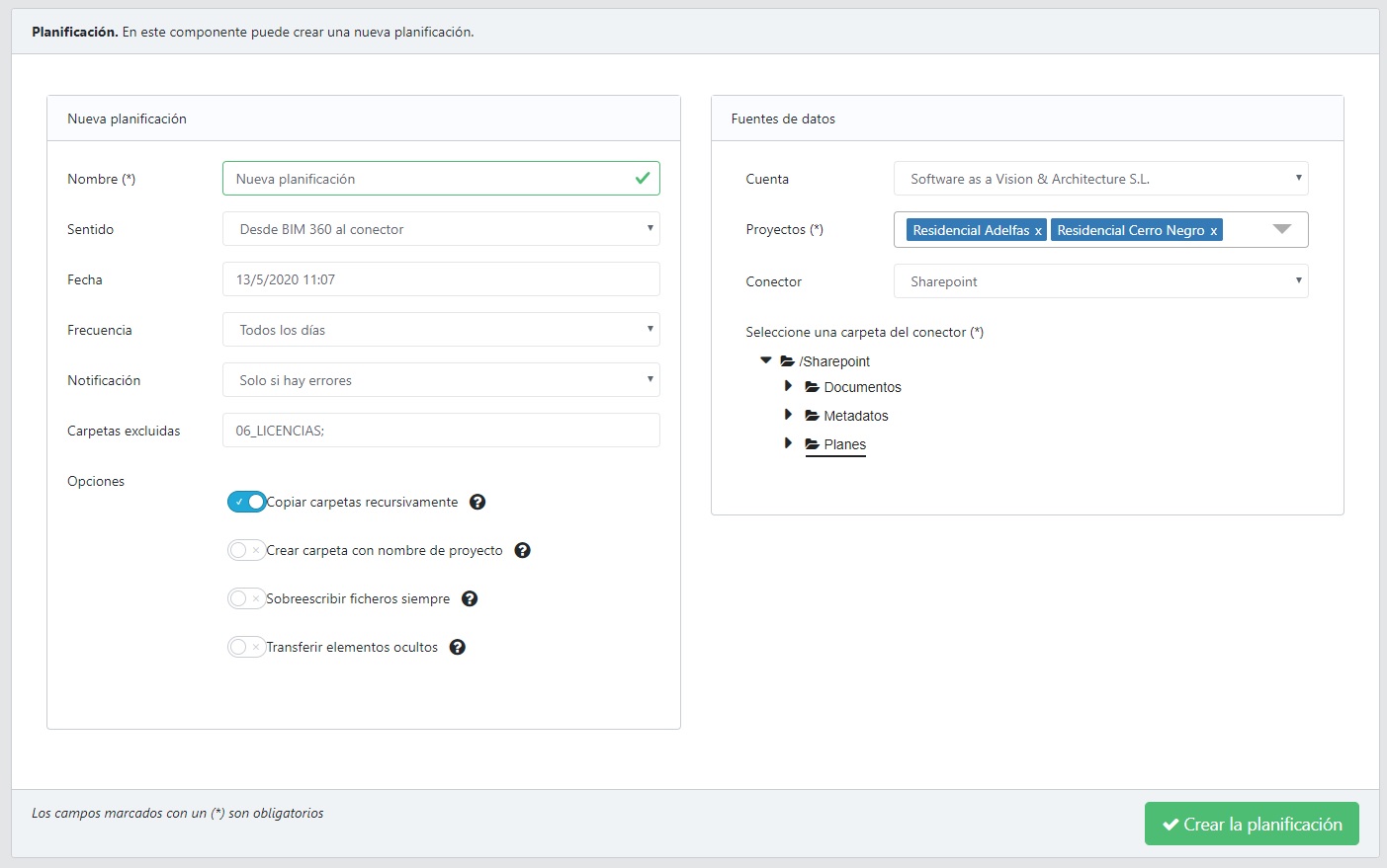 3. Crea tu primera planificación. Desde el menú planes, crea tus primeras planificaciones: elige tu cuenta, los proyectos, el conector, si es de descarga o de subida....