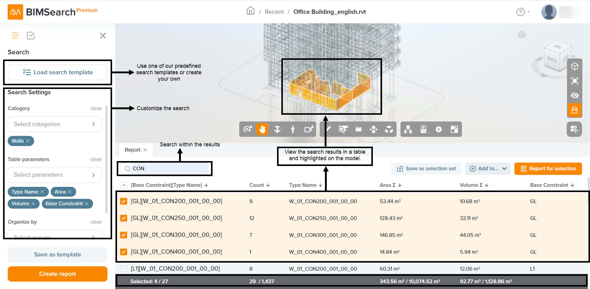 BIMSearch is a cloud-based web app that acts as a viewer for any model saved on the Autodesk BIM 360 or Autodesk Construction Cloud platforms, enabling you to quickly search the elements, view them highlighted on the model, and tabulated in a report that you can export to Excel.