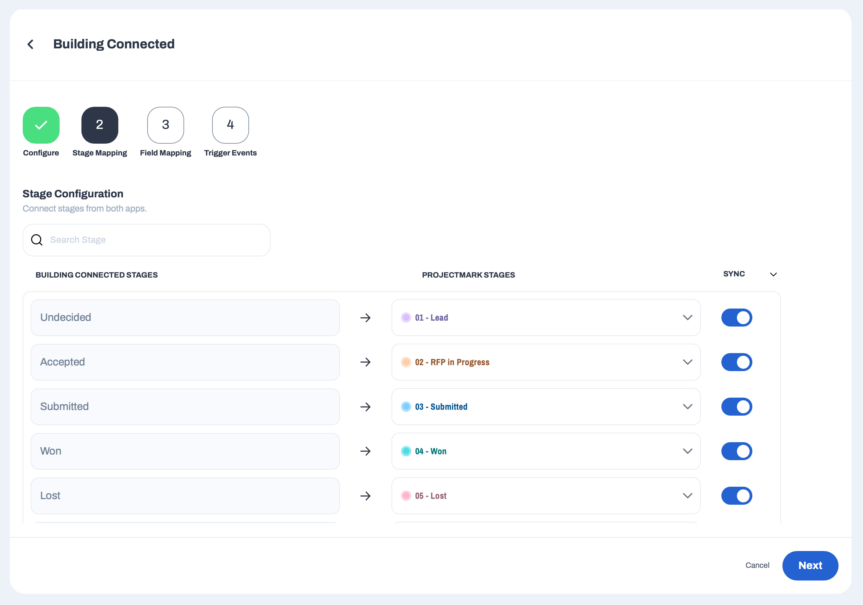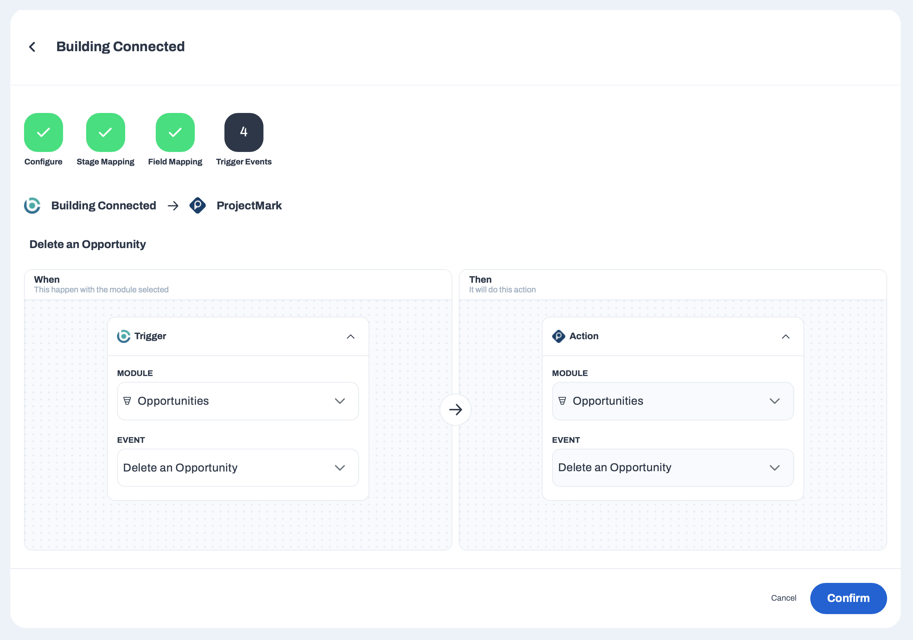 - BuildingConnected Opportunities (Bid Board Projects) -> ProjectMark Opportunities