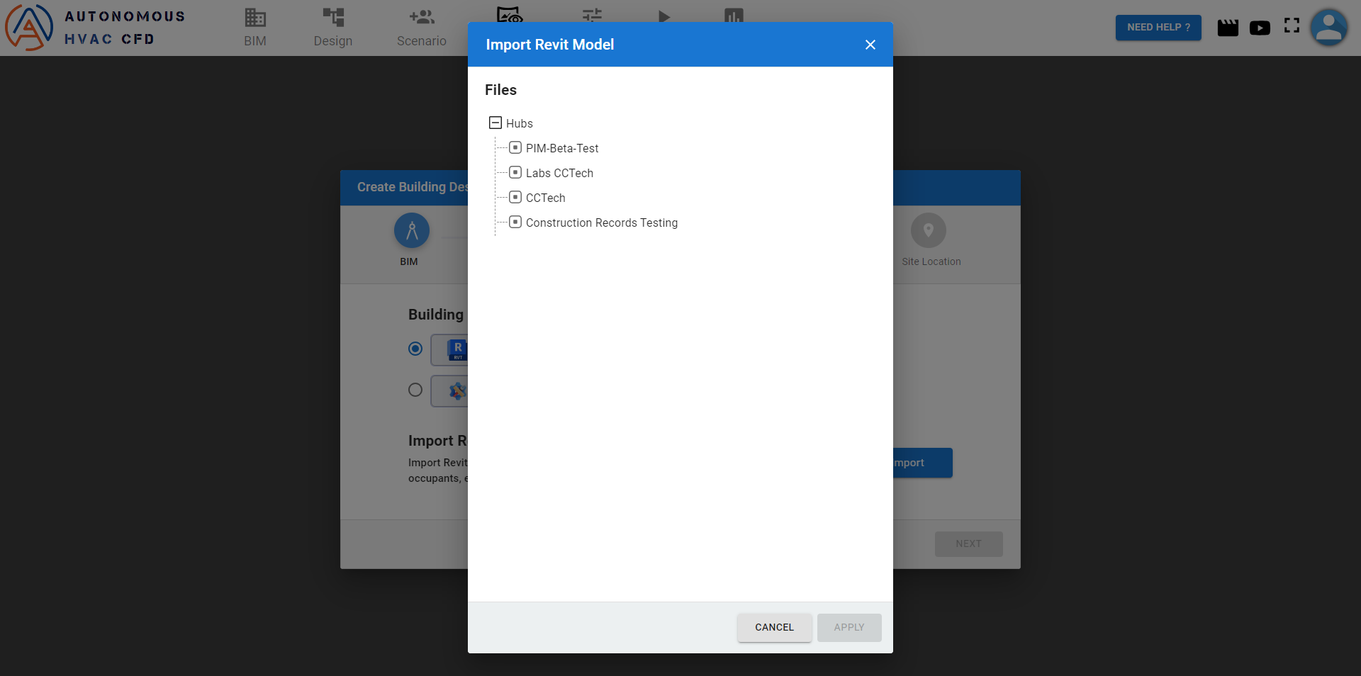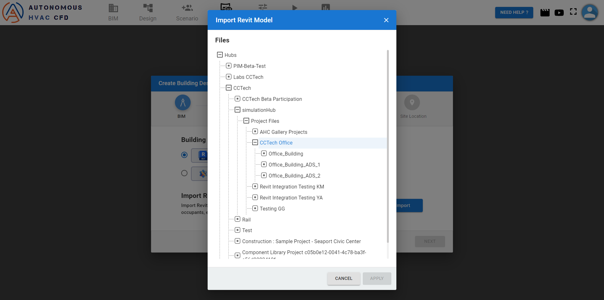 The Autonomous HVAC CFD (AHC) Connect grants read access to project information such as geometry, materials and metadata, which can be pushed to an AHC Project. After adding AHC Connect to your Autodesk Construction Cloud® account, you will also be able to view and edit Construction Cloud files inside the AHC App.
