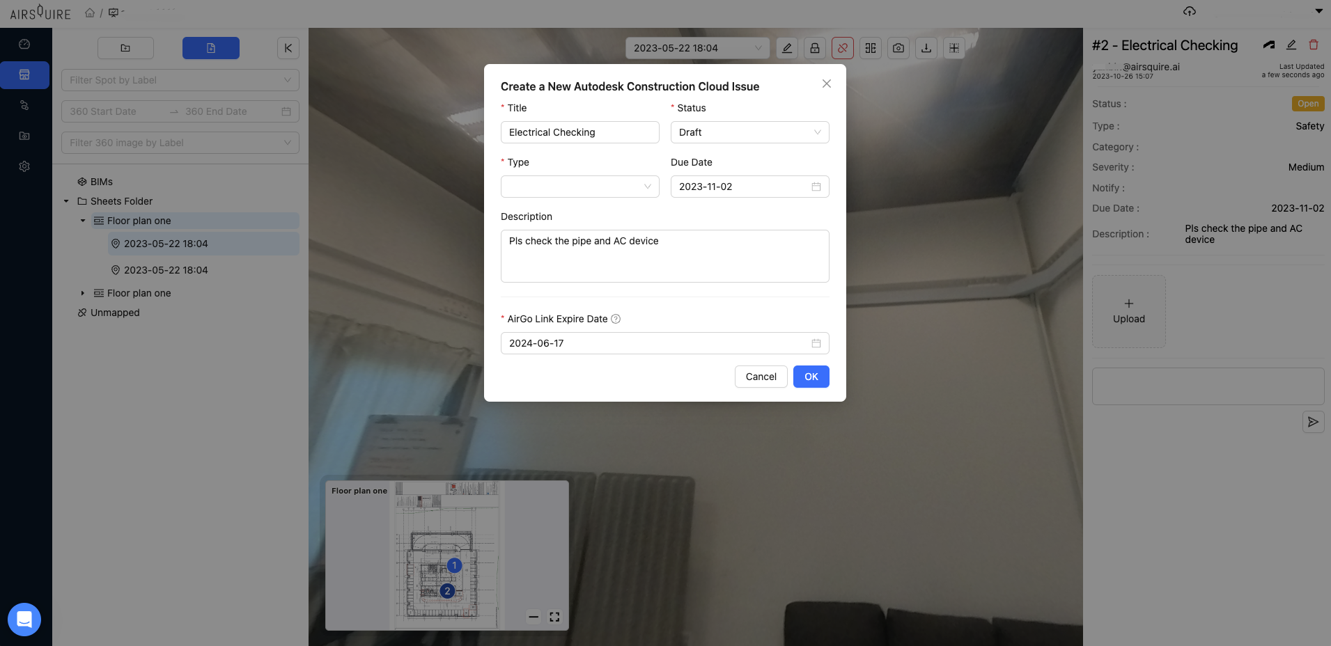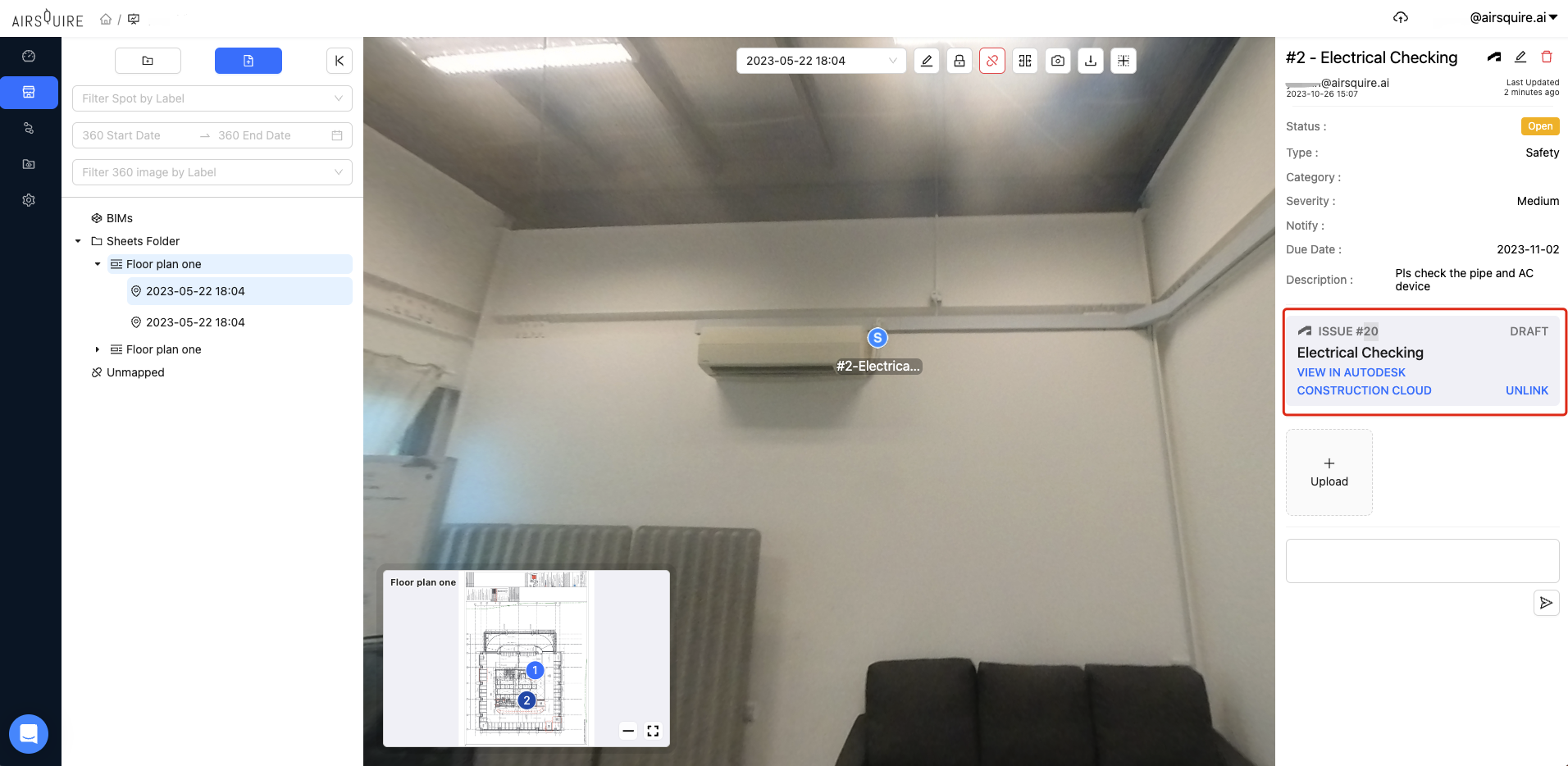 AirGo is a 360° virtual “Google Street View” of construction sites that helps project teams cost-effectively visualize and manage progress. You can visualize your construction virtual site in 360° anytime, anywhere; And traverse to any moment in your project like a time capsule.
