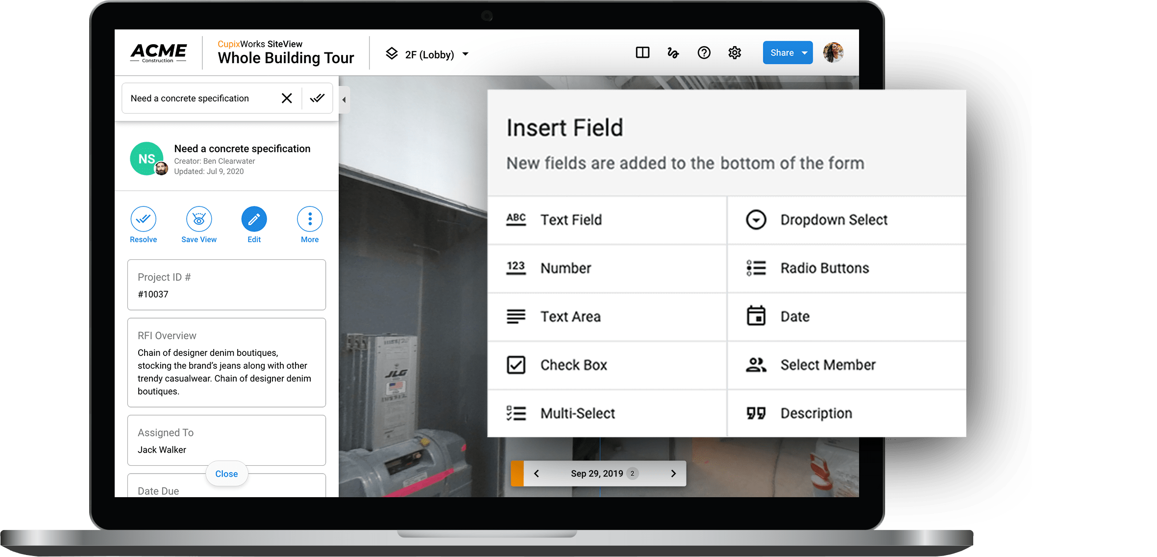 CupixWorks users can also create BIM 360 Issues and RFIs while virtually walking the project site within CupixWorks SiteView, and mark the locations of these issues with 3D coordinates within the space. These BIM 360 annotations within SiteView are directly linked to their corresponding documents in Autodesk BIM 360 Docs. As colleagues navigate the 3D digital twins of the jobsite, they can view any BIM 360 annotations within and open the annotations in Autodesk BIM 360 to respond or view additional details.