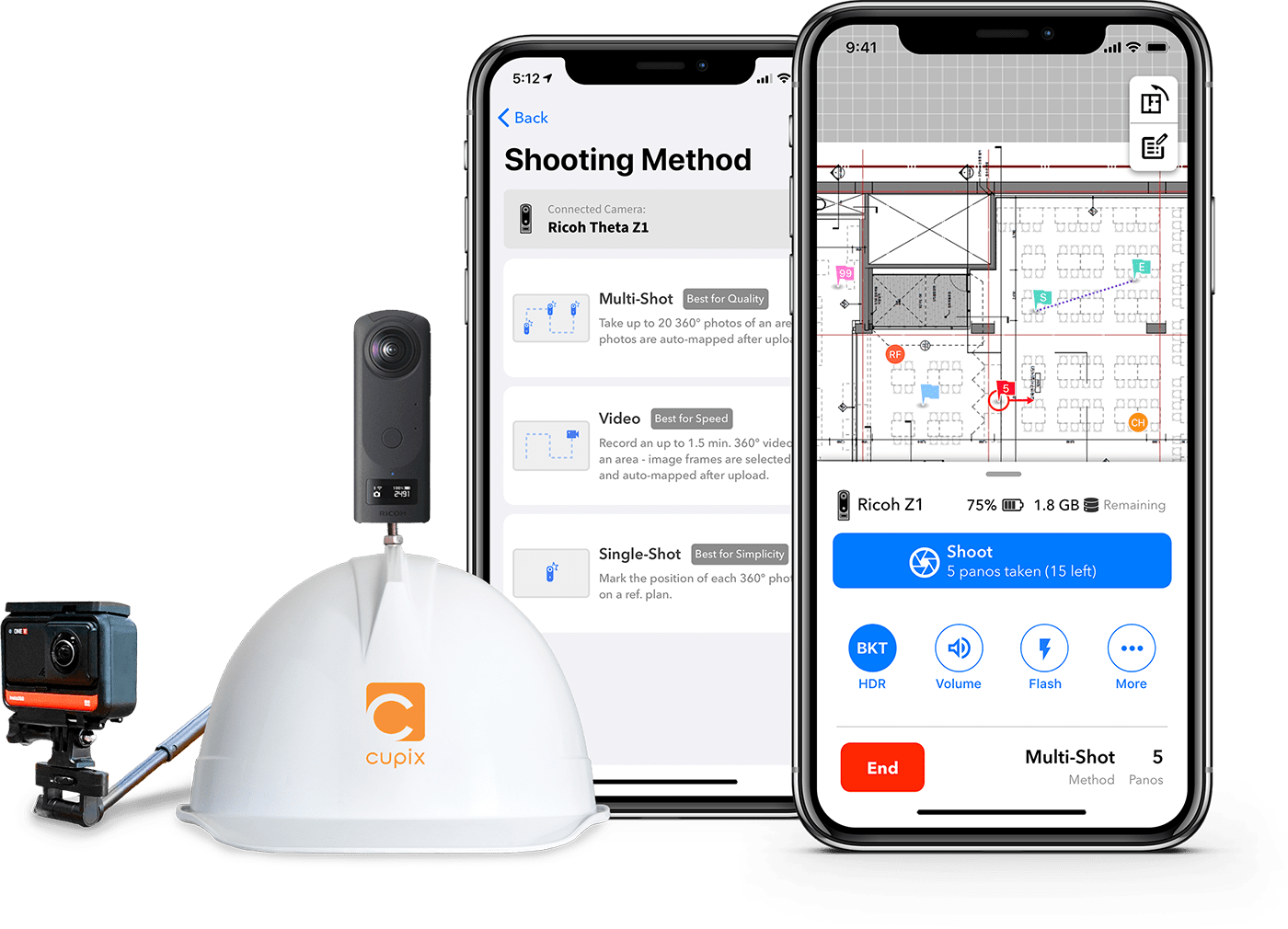 CupixWorks is a machine vision-powered software built for the AEC industry that transforms 360° photos and 360° videos into a 3D digital twin. All you need are the Cupix Capture mobile app and a 360° camera. Mount the 360° camera on your hard hat (or just hold it on a selfie stick), walk through your jobsite, and let Cupix take care of the rest! After uploading your capture, Cupix will automatically create a Google Street View-like 3D digital twin of your jobsite, which you can walk through online and share with your colleagues from our SiteView virtual jobsite viewer.