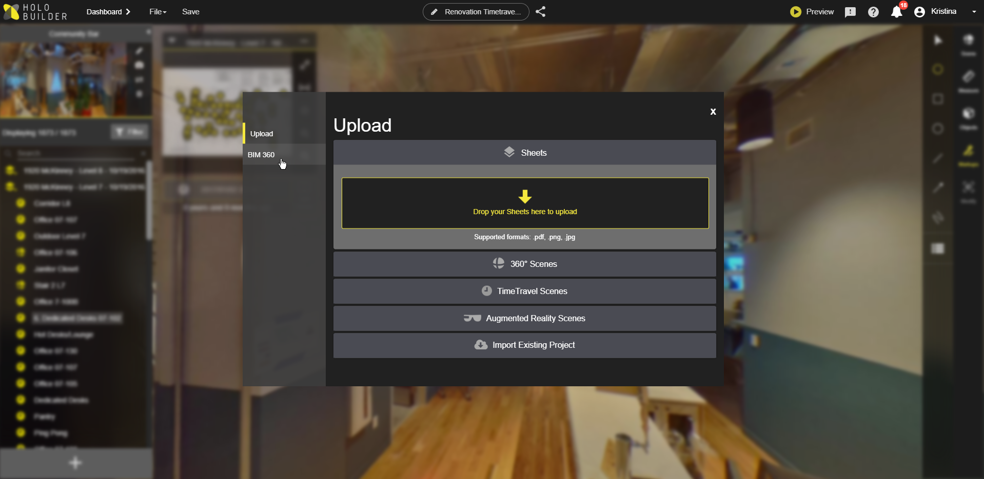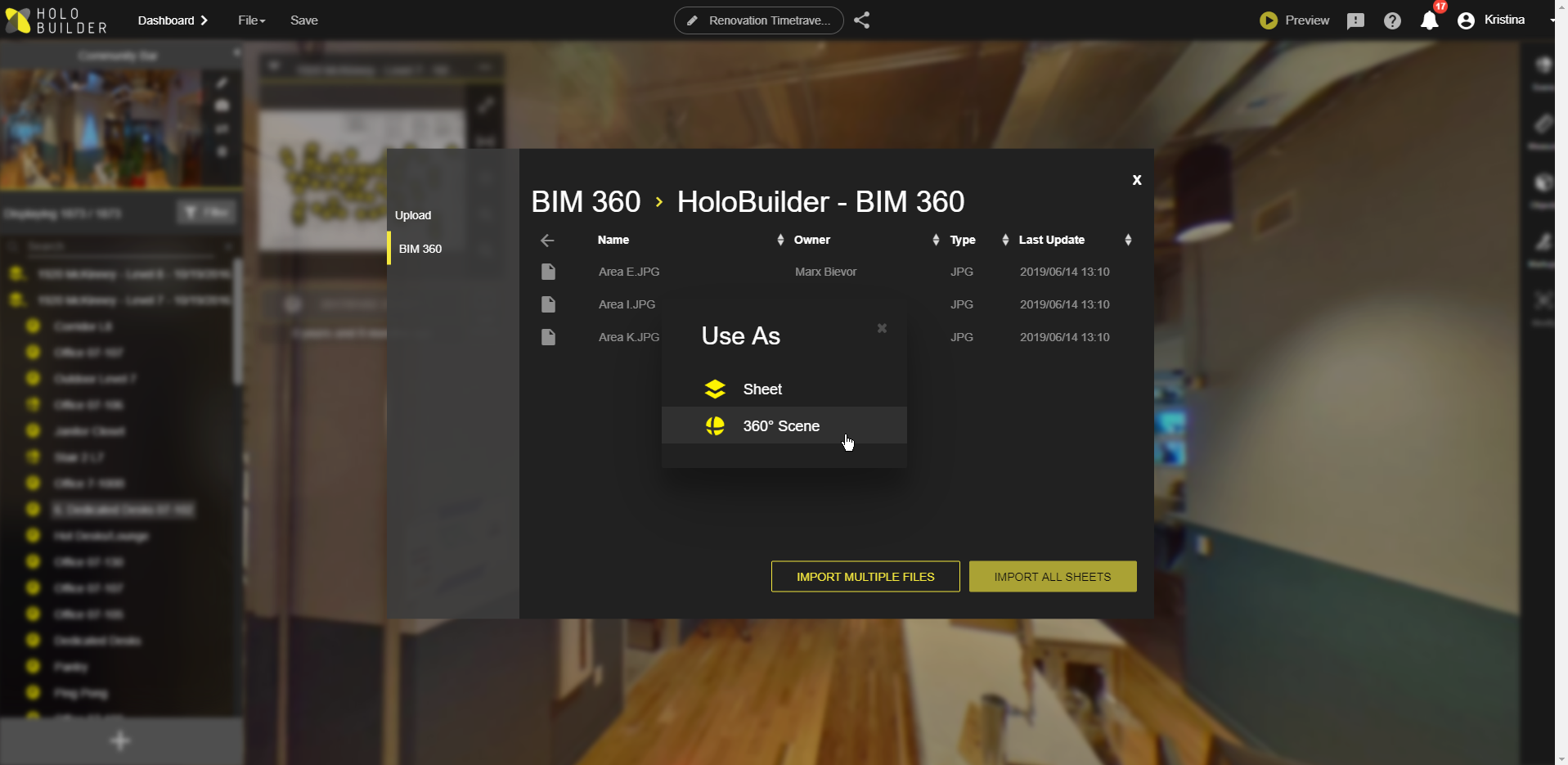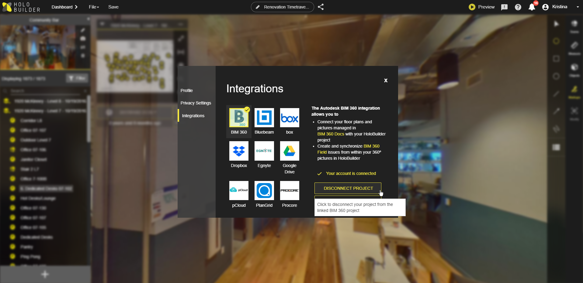 Users have the option to sign into HoloBuilder with their BIM 360 credentials. Users can connect floor plans and pictures managed in BIM 360 Docs and integrate them directly into HoloBuilder projects without having to download them first. All floor plans can be accessed directly within the HoloBuilder project at any time. Once 360º images are captured within HoloBuilder, the user can create BIM 360 Field Management Next Gen issues directly within these scenes in the Web Editor. The created issues can be accessed both, inside HoloBuilder as well as BIM 360 Field Management. All issues can be managed in BIM 360 Field Management with each BIM 360 Field Management issue containing a link to the HoloBuilder 360º image for visualization.