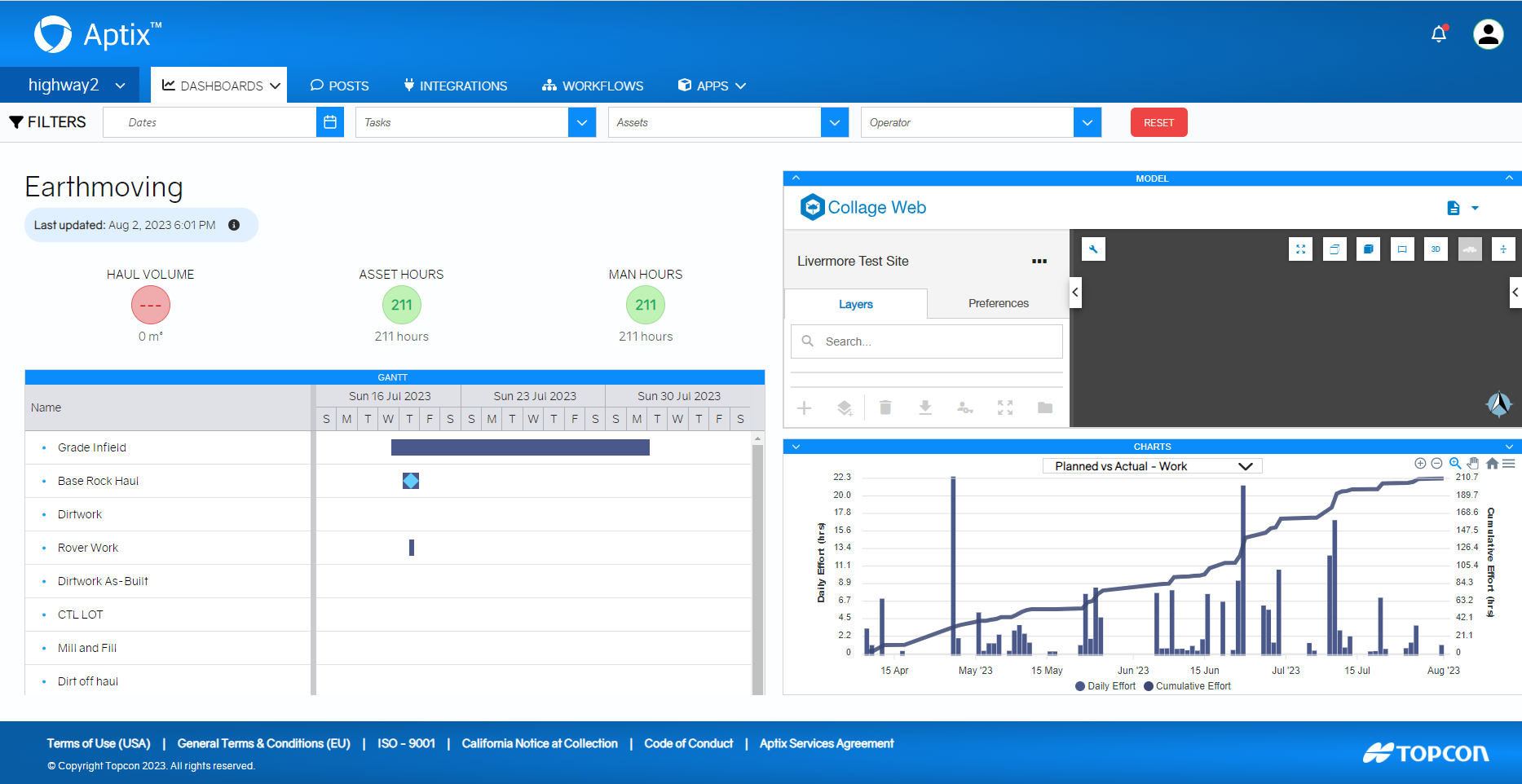 As part of the Topcon family of products, Aptix™ integrates both software applications and sensor applications to provide summary reports on materials, people, and equipment. Aptix™ delivers a multiplier effect benefit by integrating several typically disparate project data sources into one automated workflow and reporting process. Aptix™ integrates third-party applications from scheduling to reporting to telematics and machine control systems. With the Aptix™ platform, you can integrate third-party AEC software, including scheduling and other field operations tooling to build a Digital Twin of your jobsite.