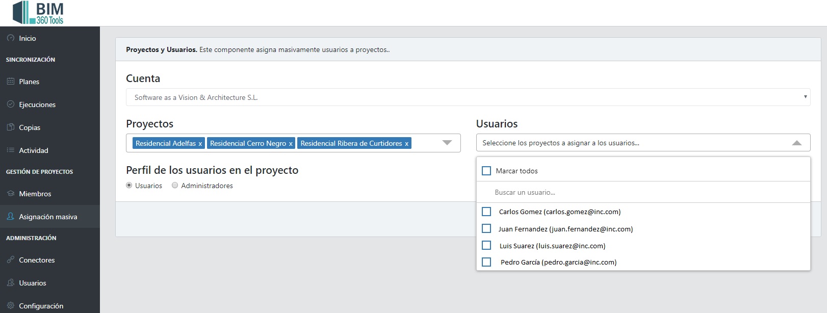 Finalmente nos permite agregar usuarios de forma masiva a nuestros proyectos en BIM360. Por ejemplo cuando entra un empleado nuevo en la empresa, ya no lo tenemos que agregar 200 veces a 200 proyectos, con 360 Tools, lo agrego una única vez a todos de golpe.