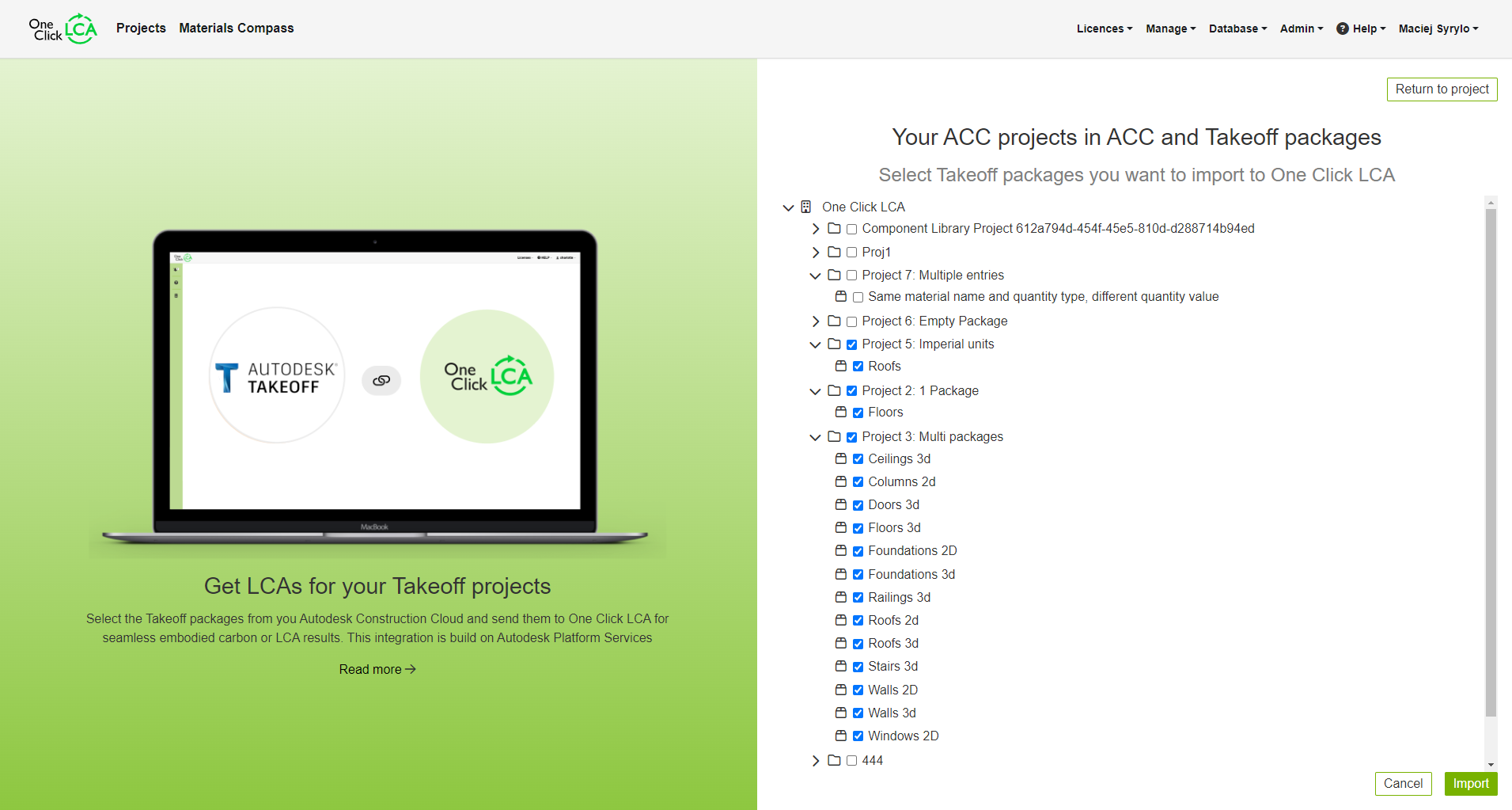 The One Click LCA plugin for Autodesk® Takeoff delivers instant certification and standards-compliant LCA from your Takeoff packages. The integration works with packages set up based on 2D drawings and also 3D models. The integration allows you to import Takeoff packages into the One Click LCA platform, automatically detecting the materials used in your estimations and calculating their environmental impacts.