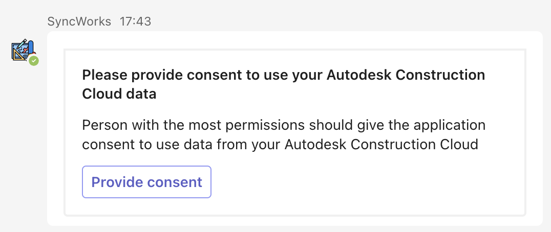 The integration uses a 3 legged authentication once the user provides consent to SyncWorks. The authentication is used to import data (hubs, projects, issues, and issue comments) from your Autodesk Construction Cloud to detect entity updates.