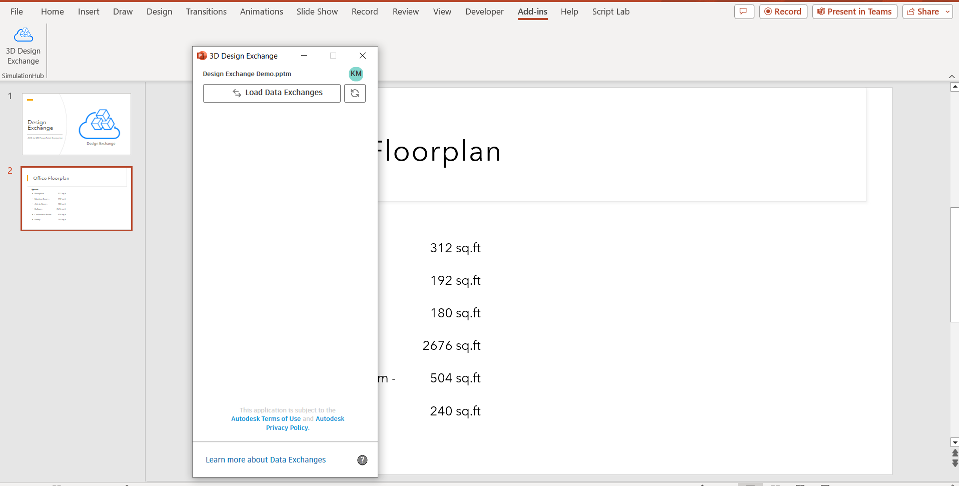 The 3D Design Exchange Connector grants read access to project information such as 3D geometry which can be in MS PowerPoint. After adding the 3D Design Exchange Connector to your Autodesk Construction Cloud® account, you will also be able to view Construction Cloud files inside the MS PowerPoint App.