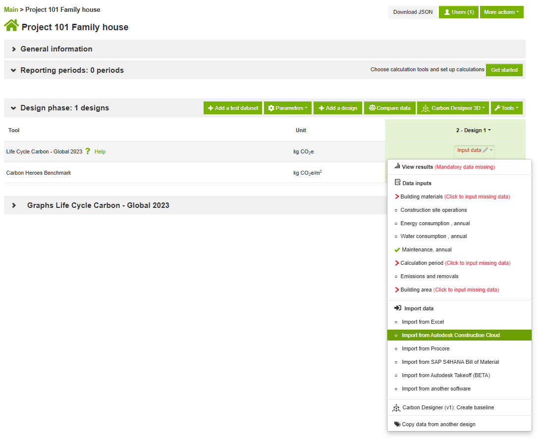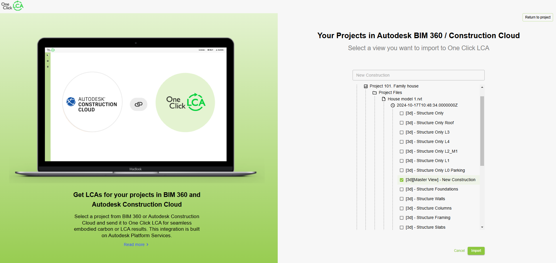 To use the integration, the user needs an appropriate project on One Click LCA. For this, ensure you have a private project in One Click LCA before starting the import process. See how to create a project in One Click LCA here. Review the license requirements for importing data here. See how to get a free trial version