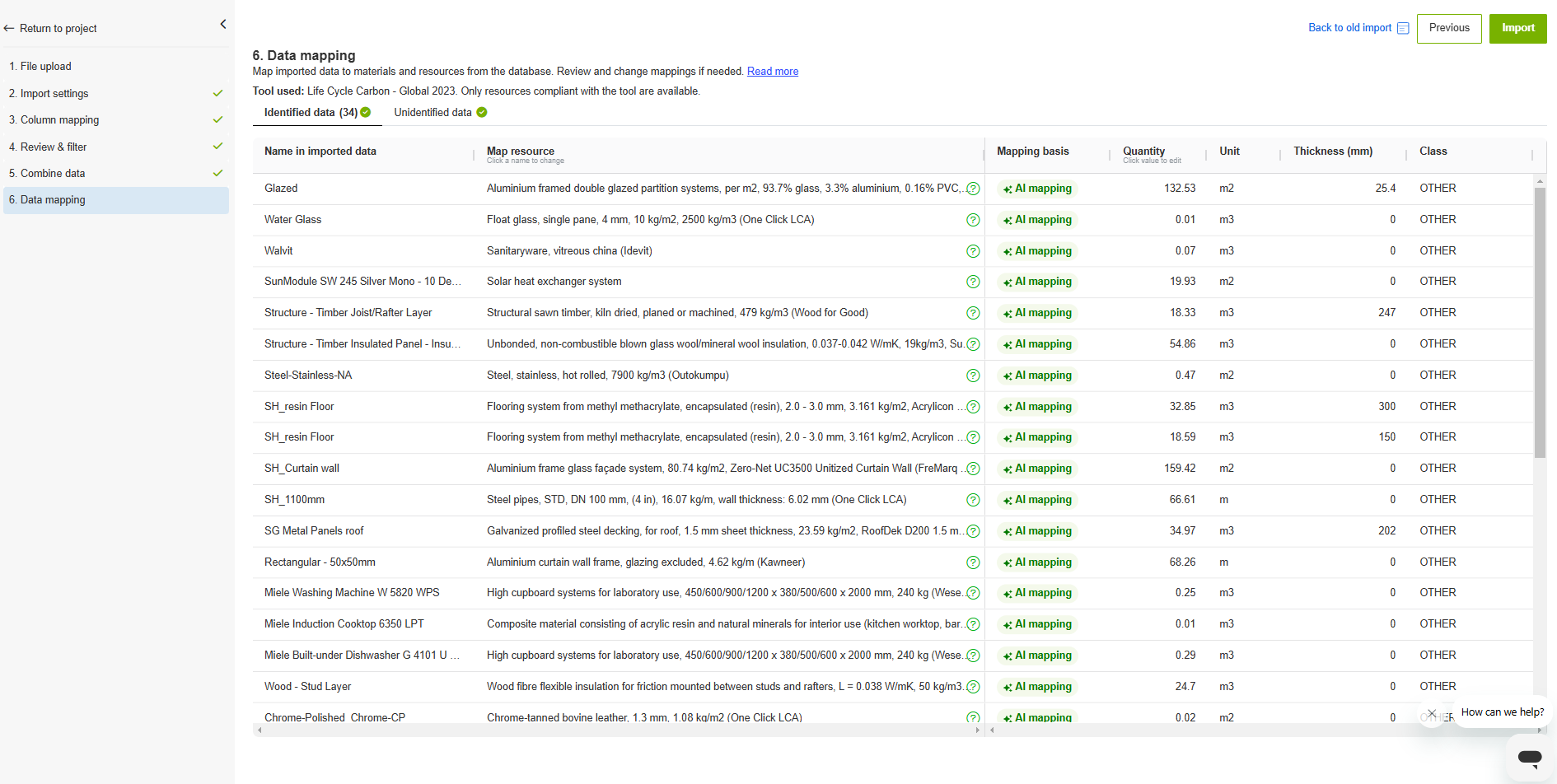 The integration generates a bill of material based on the selected view of the uploaded Revit model and allows you to import that bill of material into the One Click LCA platform, automatically identifying the materials used in your estimations and calculating their environmental impacts.