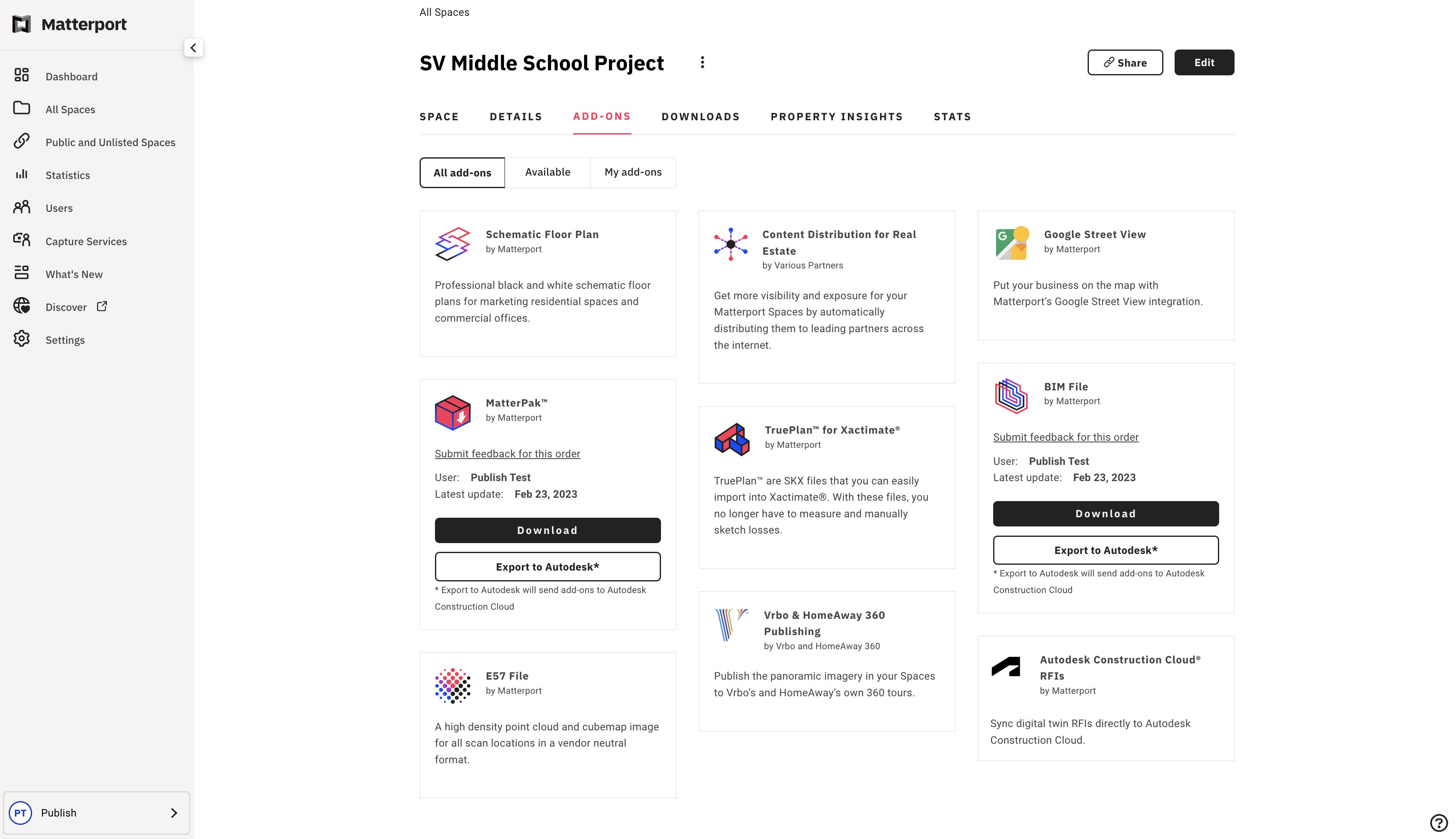 When the user wants to select the option 'Export to Autodesk' from the Matterport url under Spaces-> Add-ons.
