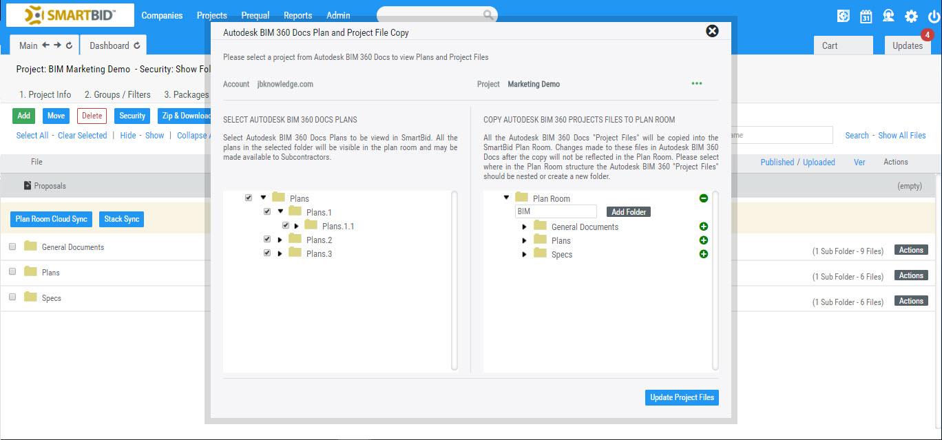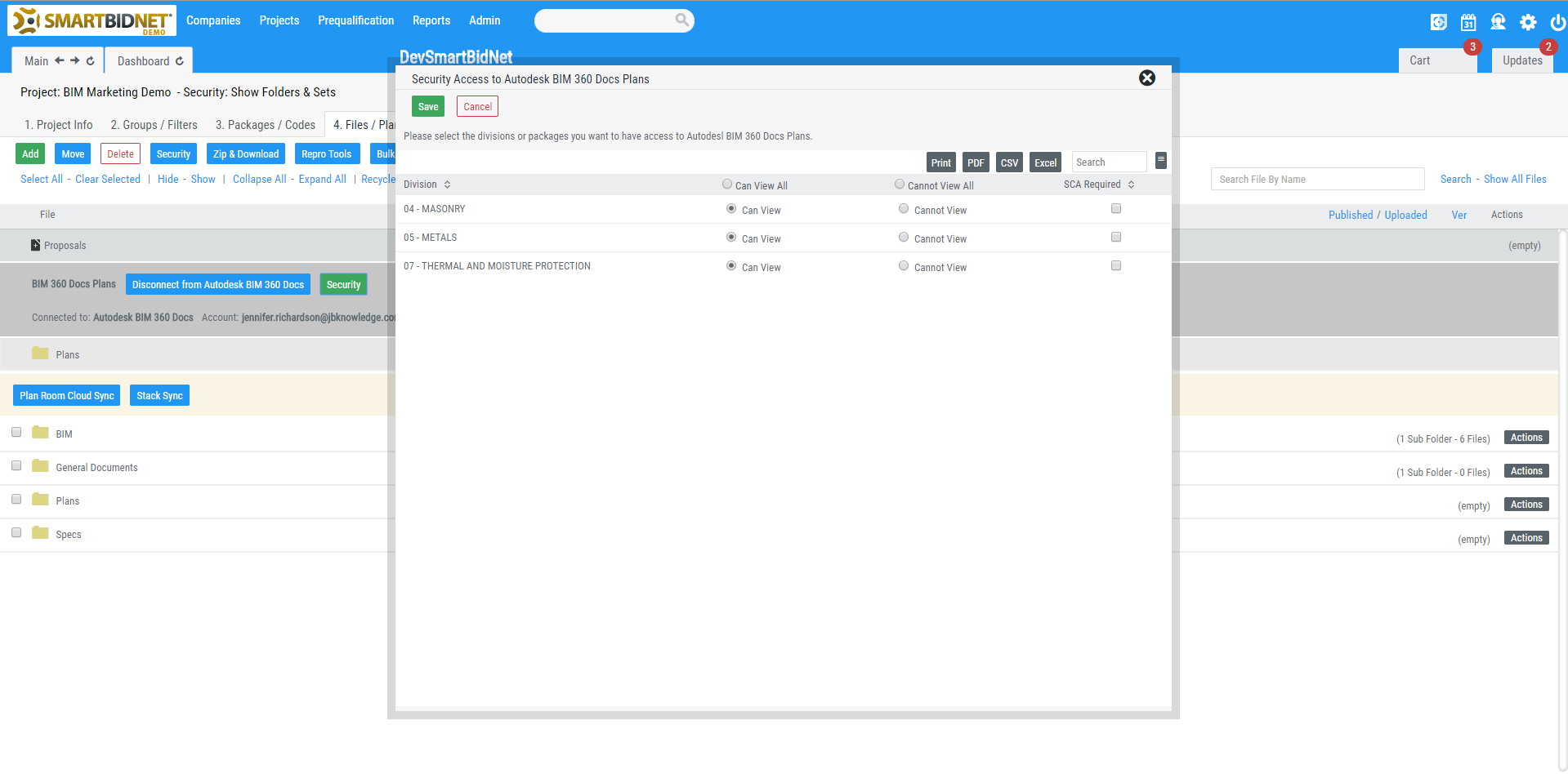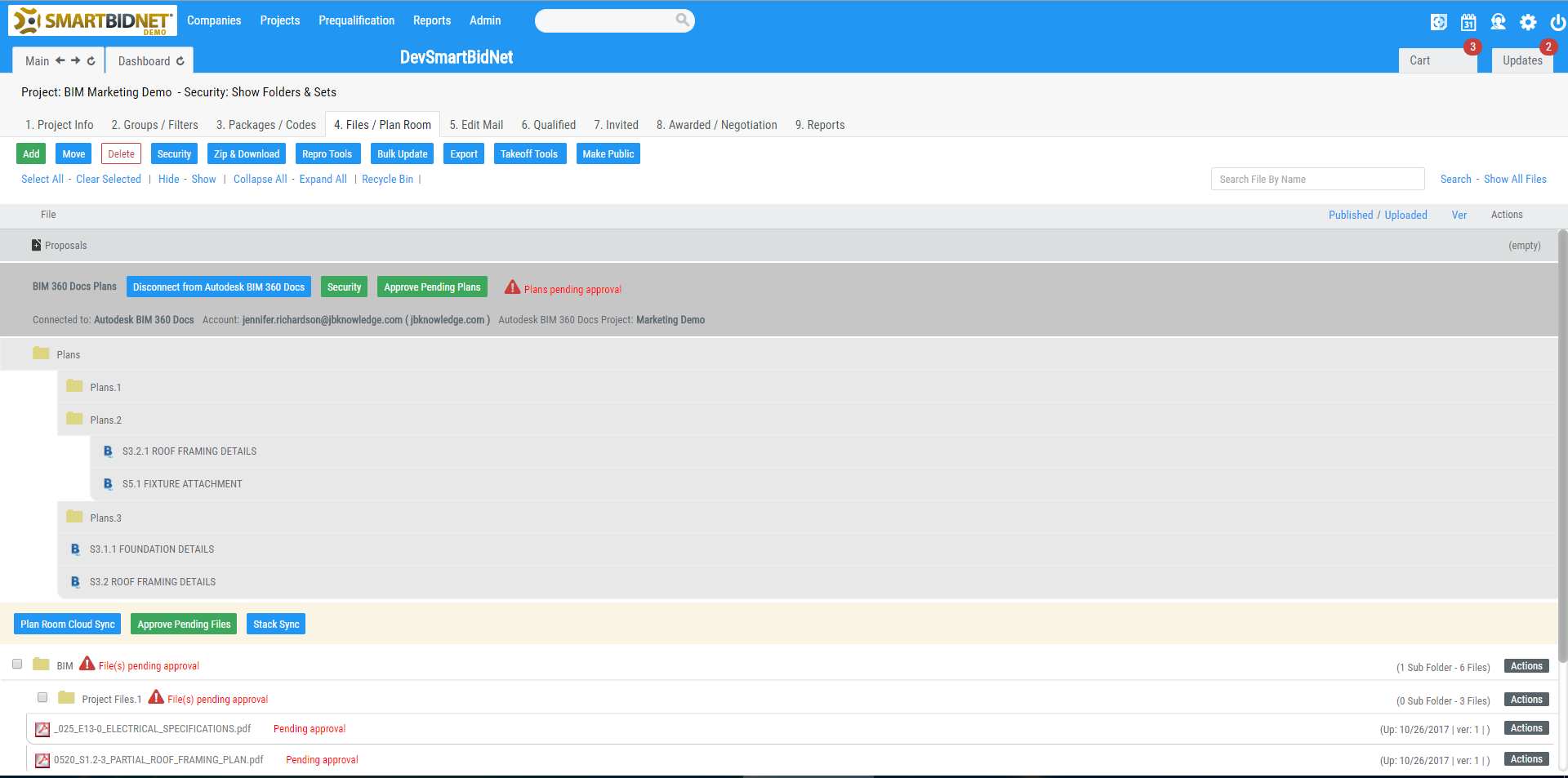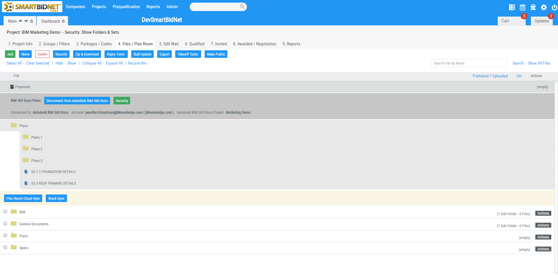 Easily connect both of your accounts to access the optimized project document management tool. Once your accounts have been linked, your selected BIM 360 Docs project files and plans are implemented into your SmartBid plan room files structure, as well as synced with any future changes made in the BIM 360 platform. Choose the security of the project plans and files shown to your subcontractors to avoid the unintentional publication of sensitive information. Allow your subcontractors to view your enhanced project plan room and files in one central location to provide you a qualified, optimal bid for every project.
