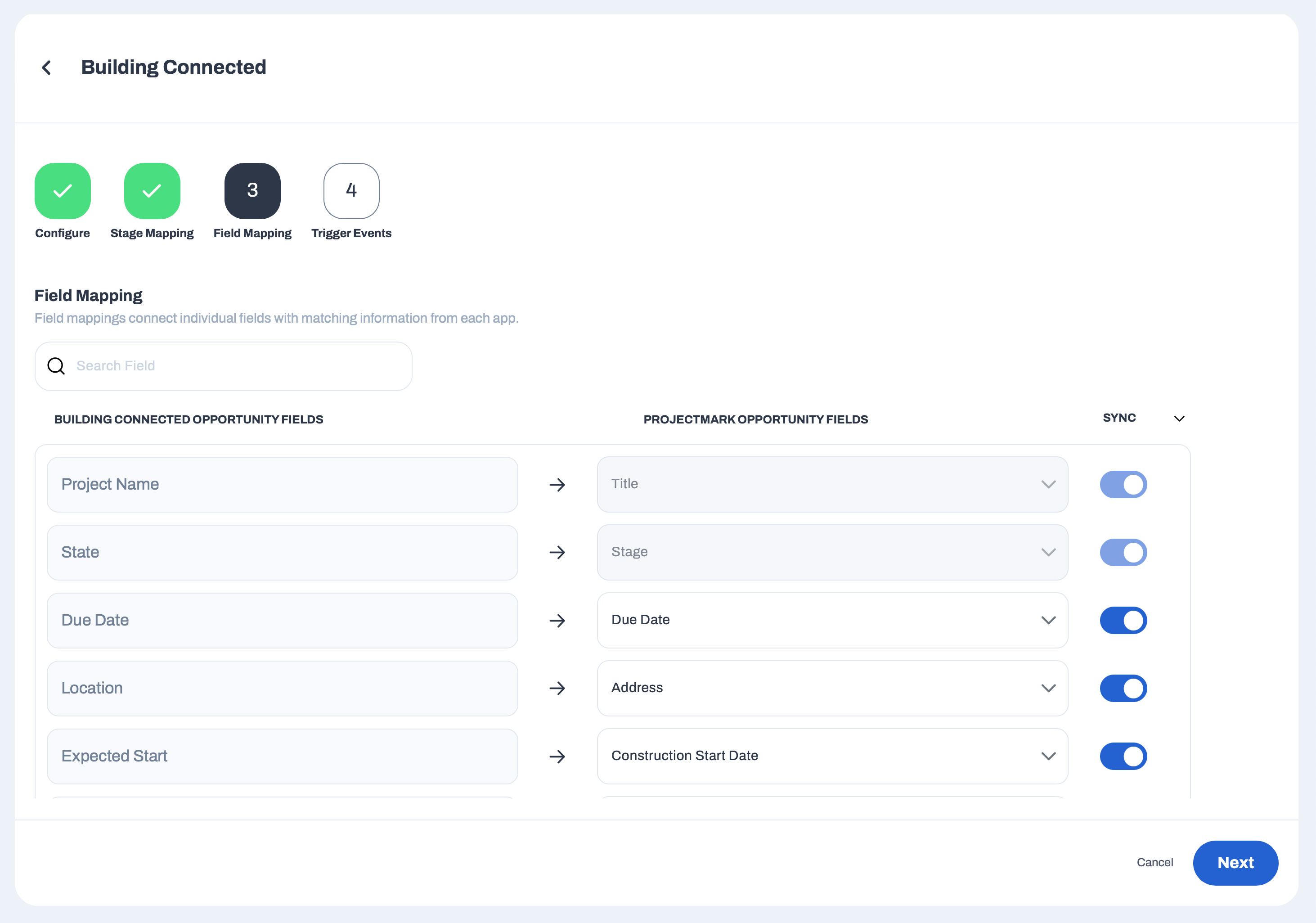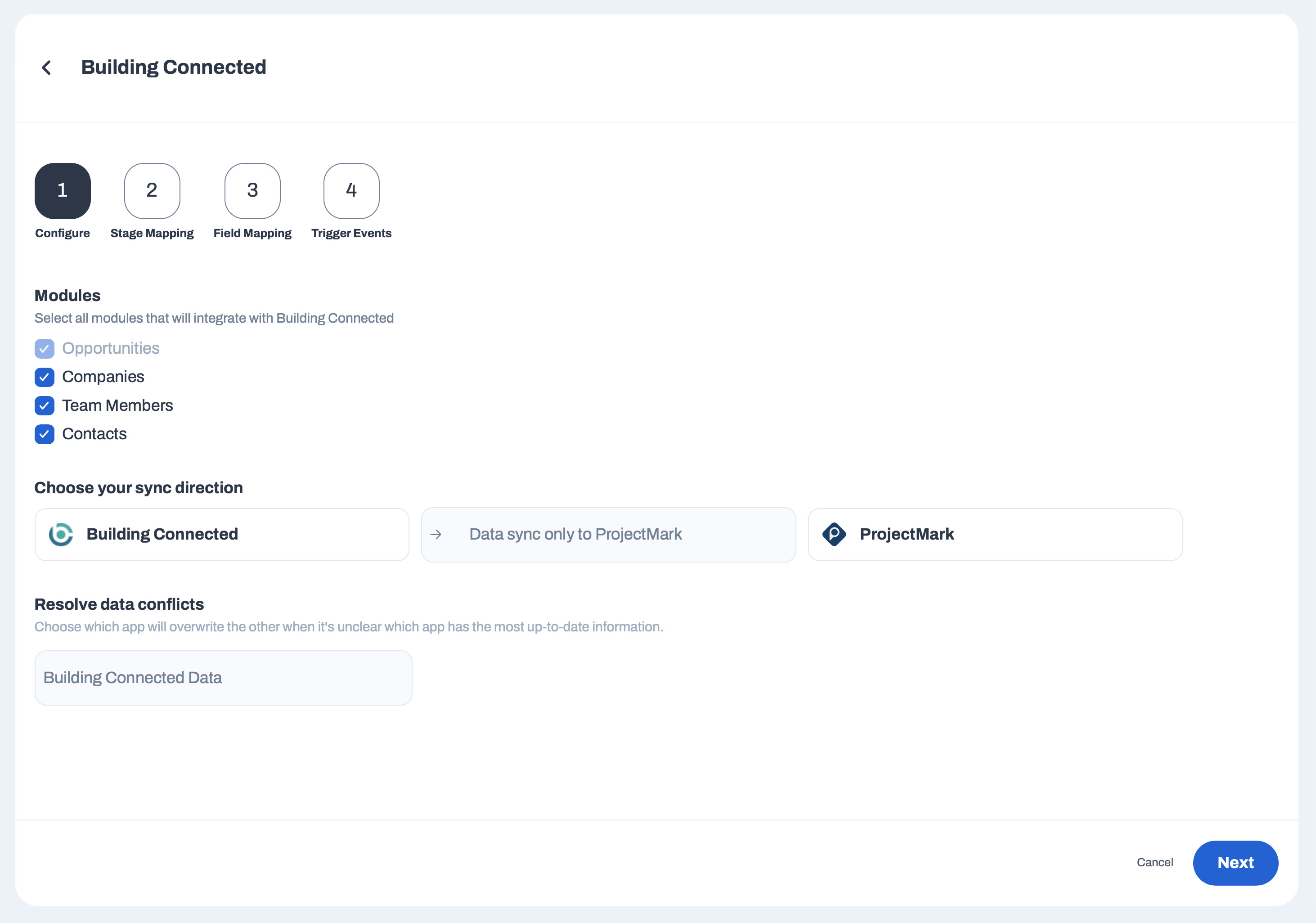 - BuildingConnected Opportunities (Bid Board Projects) -> ProjectMark Opportunities