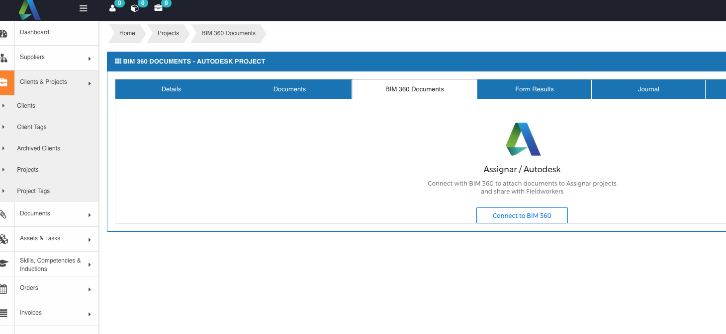 Now you can integrate your Autodesk® BIM 360® documents with Assignar dashboard and mobile app. From inside Assignar dashboard, all you need to do is to access your project, go to the tab “BIM 360 Documents” and log in with your BIM 360 user id. Once you are logged in, Assignar will show you all your BIM 360 projects and their document trees. Choose as many documents as you want and save. Done!